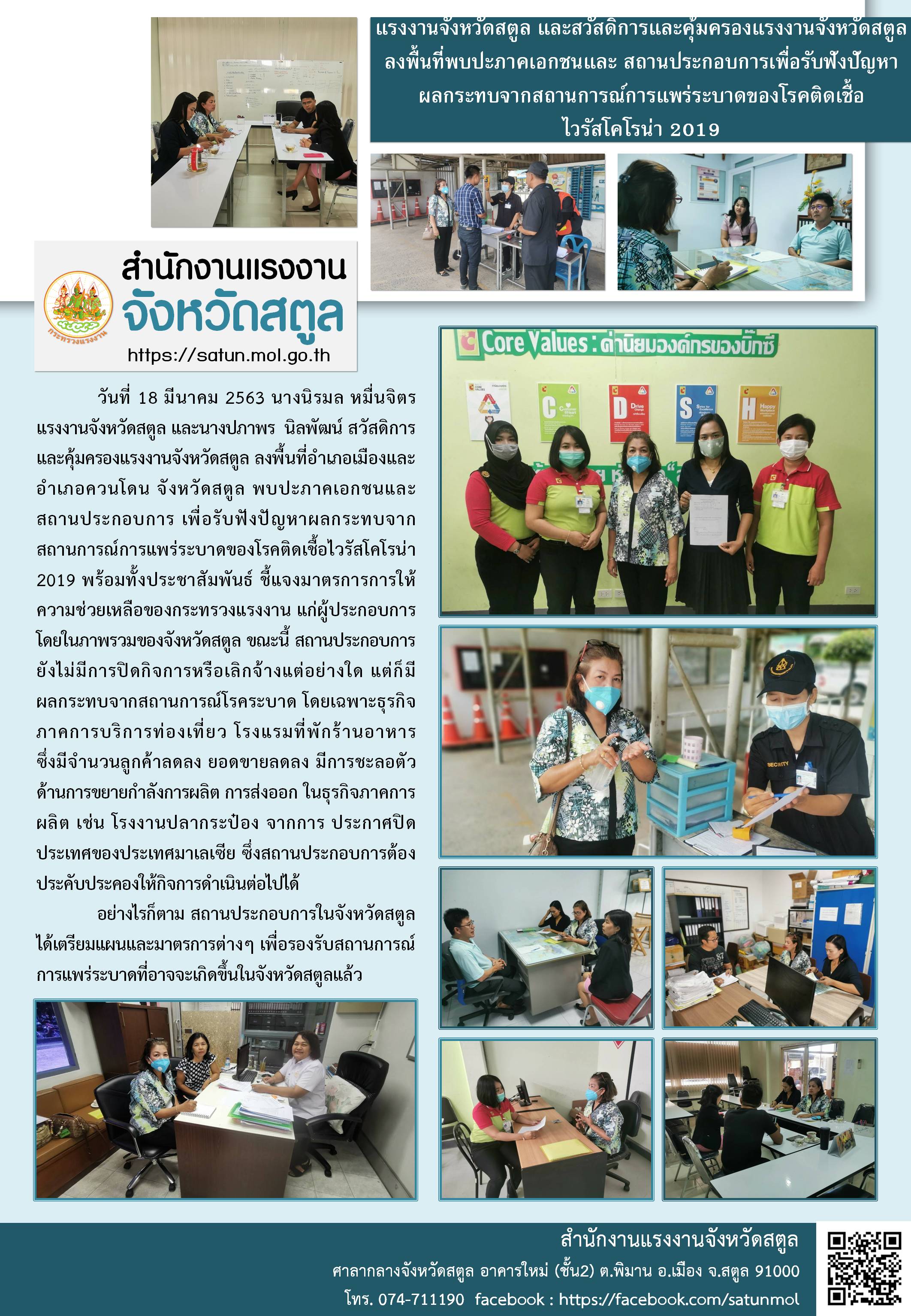 วันที่ 18 มีนาคม 2563 นางนิรมล หมื่นจิตรแรงงานจังหวัดสตูล และนางปภาพร นิลพัฒน์ สวัสดิการและคุ้มครองแรงงานจังหวัดสตูล ลงพื้นที่อำเภอเมืองและอำเภอควนโดน จังหวัดสตูล พบปะภาคเอกชนและ สถานประกอบการ เพื่อรับฟังปัญหาผลกระทบจากสถานการณ์การแพร่ระบาดของโรคติดเชื้อไวรัสโคโรน่า2019 พร้อมทั้งประชาสัมพันธ์ ชี้แจงมาตรการการให้ความช่วยเหลือของกระทรวงแรงงาน แก่ผู้ประกอบการโดยในภาพรวมของจังหวัดสตูล ขณะนี้ สถานประกอบการ ยังไม่มีการปิดกิจการหรือเลิกจ้างแต่อย่างใด แต่ก็มีผลกระทบจากสถานการณ์โรคระบาด โดยเฉพาะธุรกิจภาคการบริการท่องเที่ยว โรงแรมที่พักร้านอาหาร ซึ่งมีจำนวนลูกค้าลดลง ยอดขายลดลง มีการชะลอตัวด้านการขยายกำลังการผลิต การส่งออก ในธุรกิจภาคการผลิต เช่น โรงงานปลากระป๋อง จากการ ประกาศปิดประเทศของประเทศมาเลเซีย ซึ่งสถานประกอบการต้องประคับประคองให้กิจการดำเนินต่อไปได้