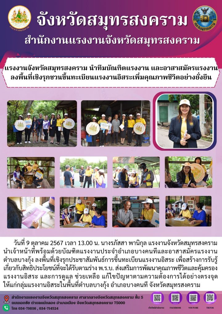 วันที่ 9 ตุลาคม 2567 เวลา 13.00 น. นางรภัสสา พานิกุล แรงงานจังหวัดสมุทรสงคราม นำเจ้าหน้าที่พร้อมด้วยบัณฑิตแรงงานประจำอำเภอบางคนที และอาสาสมัครแรงงาน ตำบลบางกุ้ง