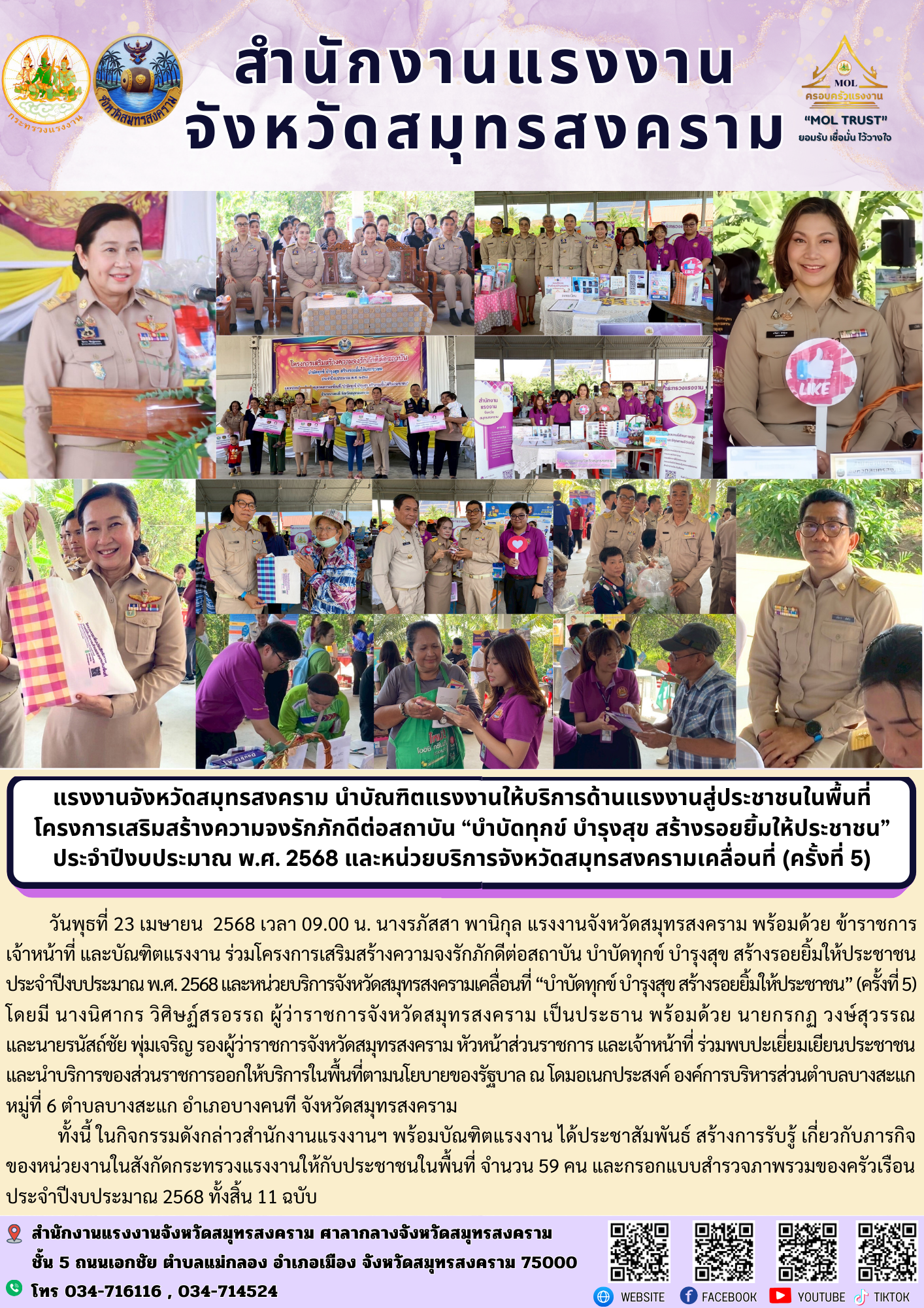 วันพุธที่ 23 เมษายน 2568 เวลา 09.00 น. นางรภัสสา พานิกุล แรงงานจังหวัดสมุทรสงคราม พร้อมด้วย ข้าราชการ เจ้าหน้าที่ และบัณฑิตแรงงาน ร่วมโครงการเสริมสร้างความจงรักภักดีต่อสถาบัน บำบัดทุกข์ บำรุงสุข สร้างรอยยิ้มให้ประชาชน ประจำปีงบประมาณ พ.ศ. 2568 และหน่วยบริการจังหวัดสมุทรสงครามเคลื่อนที่ “บำบัดทุกข์ บำรุงสุข สร้างรอยยิ้มให้ประชาชน” (ครั้งที่ 5)โดยมี นางนิศากร วิศิษฏ์สรอรรถ ผู้ว่าราชการจังหวัดสมุทรสงคราม เป็นประธาน พร้อมด้วย นายกรกฏ วงษ์สุวรรณ และนายรนัสถ์ชัย พุ่มเจริญ รองผู้ว่าราชการจังหวัดสมุทรสงคราม หัวหน้าส่วนราชการ และเจ้าหน้าที่ ร่วมพบปะเยี่ยมเยียนประชาชนและนำบริการของส่วนราชการออกให้บริการในพื้นที่ตามนโยบายของรัฐบาล ณ โดมอเนกประสงค์ องค์การบริหารส่วนตำบลบางสะแกหมู่ที่ 6 ตำบลบางสะแก อำเภอบางคนที จังหวัดสมุทรสงคราม