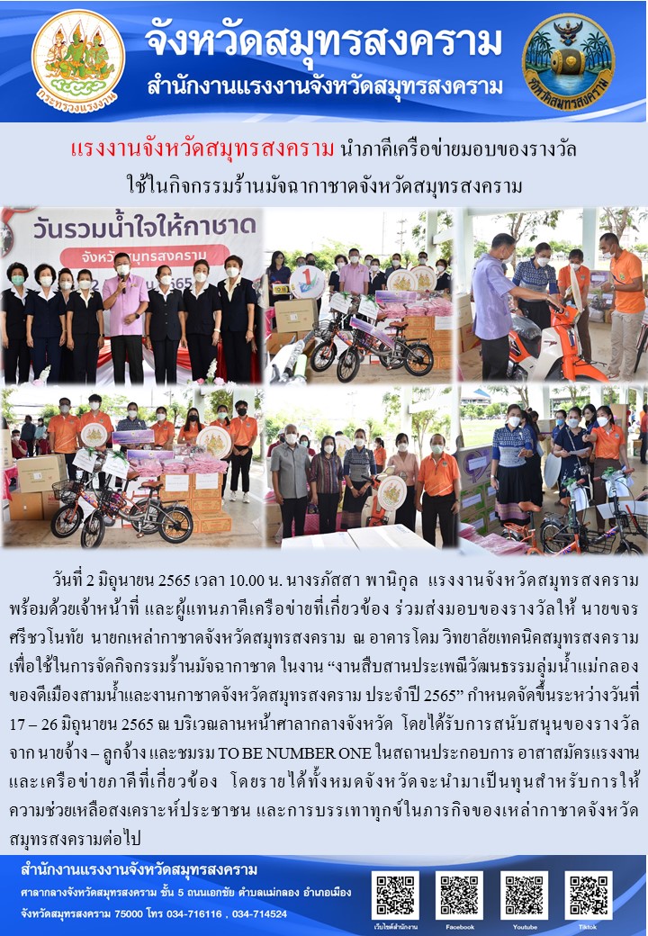 วันที่ 2 มิถุนายน 2565 เวลา 10.00 น. นางรภัสสา พานิกุล แรงงานจังหวัดสมุทรสงคราม พร้อมด้วยเจ้าหน้าที่ และผู้แทนภาคีเครือข่ายที่เกี่ยวข้อง ร่วมส่งมอบของรางวัลให้ นายขจร ศรีชวโนทัย นายกเหล่ากาชาดจังหวัดสมุทรสงคราม ณ อาคารโดม วิทยาลัยเทคนิคสมุทรสงคราม เพื่อใช้ในการจัดกิจกรรมร้านมัจฉากาชาด ในงาน “งานสืบสานประเพณีวัฒนธรรมลุ่มน้ำแม่กลอง ของดีเมืองสามน้ำและงานกาชาดจังหวัดสมุทรสงคราม ประจำปี 2565” กำหนดจัดขึ้นระหว่างวันที่ 17 – 26 มิถุนายน 2565 ณ บริเวณลานหน้าศาลากลางจังหวัด โดยได้รับการสนับสนุนของรางวัลจาก นายจ้าง – ลูกจ้าง และชมรม TO BE NUMBER ONE ในสถานประกอบการ อาสาสมัครแรงงาน และเครือข่ายภาคีที่เกี่ยวข้อง โดยรายได้ทั้งหมดจังหวัดจะนำมาเป็นทุนสำหรับการให้