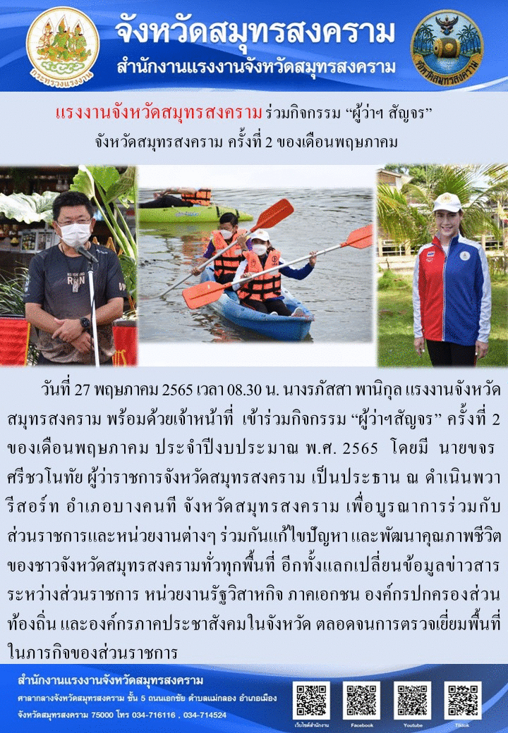 วันที่ 27 พฤษภาคม 2565 เวลา 08.30 น. นางรภัสสา พานิกุล แรงงานจังหวัดสมุทรสงคราม พร้อมด้วยเจ้าหน้าที่ เข้าร่วมกิจกรรม “ผู้ว่าฯสัญจร” ครั้งที่ 2 ของเดือนพฤษภาคม ประจำปีงบประมาณ พ.ศ. 2565 โดยมี นายขจร ศรีชวโนทัย ผู้ว่าราชการจังหวัดสมุทรสงคราม เป็นประธาน ณ ดำเนินพวา รีสอร์ท อำเภอบางคนที จังหวัดสมุทรสงคราม เพื่อบูรณาการร่วมกับส่วนราชการและหน่วยงานต่างๆ ร่วมกันแก้ไขปัญหา และพัฒนาคุณภาพชีวิตของชาวจังหวัดสมุทรสงครามทั่วทุกพื้นที่ อีกทั้งแลกเปลี่ยนข้อมูลข่าวสารระหว่างส่วนราชการ หน่วยงานรัฐวิสาหกิจ ภาคเอกชน องค์กรปกครองส่วนท้องถิ่น และองค์กรภาคประชาสังคมในจังหวัด ตลอดจนการตรวจเยี่ยมพื้นที่ในภารกิจของส่วนราชการ