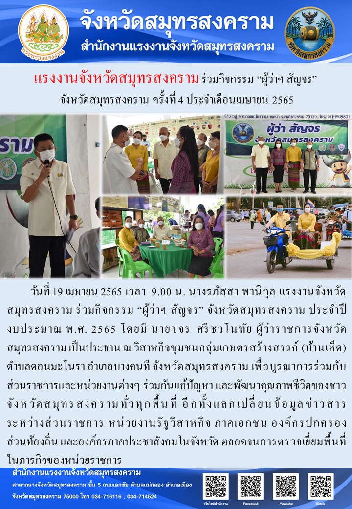 วันที่ 19 เมษายน 2565 เวลา 9.00 น. นางรภัสสา พานิกุล แรงงานจังหวัดสมุทรสงคราม ร่วมกิจกรรม “ผู้ว่าฯ สัญจร” จังหวัดสมุทรสงคราม ประจำปีงบประมาณ พ.ศ. 2565 โดยมี นายขจร ศรีชวโนทัย ผู้ว่าราชการจังหวัดสมุทรสงคราม เป็นประธาน ณ วิสาหกิจชุมชนกลุ่มเกษตรสร้างสรรค์ (บ้านเห็ด) ตำบลดอนมะโนรา อำเภอบางคนที จังหวัดสมุทรสงคราม เพื่อบูรณาการร่วมกับส่วนราชการและหน่วยงานต่างๆ ร่วมกันแก้ปัญหา และพัฒนาคุณภาพชีวิตของชาวจังหวัดสมุทรสงครามทั่วทุกพื้นที่ อีกทั้งแลกเปลี่ยนข้อมูลข่าวสารระหว่างส่วนราชการ หน่วยงานรัฐวิสาหกิจ ภาคเอกชน องค์กรปกครองส่วนท้องถิ่น และองค์กรภาคประชาสังคมในจังหวัด ตลอดจนการตรวจเยี่ยมพื้นที่ในภารกิจของหน่วยราชการ