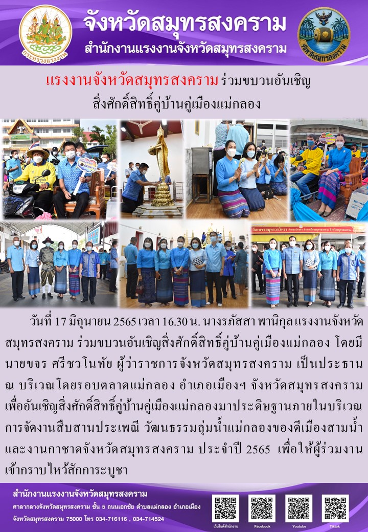 วันที่ 17 มิถุนายน 2565 เวลา 16.30 น. นางรภัสสา พานิกุล แรงงานจังหวัดสมุทรสงคราม ร่วมขบวนอันเชิญสิ่งศักดิ์สิทธิ์คู่บ้านคู่เมืองแม่กลอง โดยมี นายขจร ศรีชวโนทัย ผู้ว่าราชการจังหวัดสมุทรสงคราม เป็นประธาน ณ บริเวณโดยรอบตลาดแม่กลอง อำเภอเมืองฯ จังหวัดสมุทรสงคราม เพื่ออันเชิญสิ่งศักดิ์สิทธิ์คู่บ้านคู่เมืองแม่กลองมาประดิษฐานภายในบริเวณการจัดงานสืบสานประเพณี วัฒนธรรมลุ่มน้ำแม่กลองของดีเมืองสามน้ำและงานกาชาดจังหวัดสมุทรสงคราม ประจำปี 2565 เพื่อให้ผู้ร่วมงานเข้ากราบไหว้สักการะบูชา