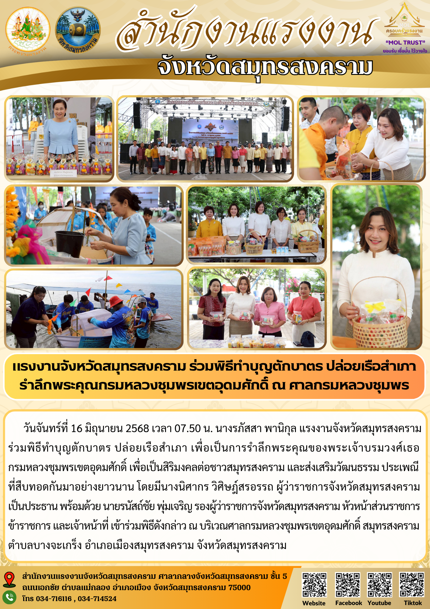 วันจันทร์ที่ 16 มิถุนายน 2568 เวลา 07.50 น. นางรภัสสา พานิกุล แรงงานจังหวัดสมุทรสงคราม ร่วมพิธีทำบุญตักบาตร ปล่อยเรือสำเภา เพื่อเป็นการรำลึกพระคุณของพระเจ้าบรมวงศ์เธอ กรมหลวงชุมพรเขตอุดมศักดิ์ เพื่อเป็นสิริมงคลต่อชาวสมุทรสงคราม และส่งเสริมวัฒนธรรม ประเพณีที่สืบทอดกันมาอย่างยาวนาน โดยมีนางนิศากร วิศิษฎ์สรอรรถ ผู้ว่าราชการจังหวัดสมุทรสงคราม เป็นประธาน พร้อมด้วย นายรนัสถ์ชัย พุ่มเจริญ รองผู้ว่าราชการจังหวัดสมุทรสงคราม หัวหน้าส่วนราชการ ข้าราชการ และเจ้าหน้าที่ เข้าร่วมพิธีดังกล่าว ณ บริเวณศาลกรมหลวงชุมพรเขตอุดมศักดิ์ สมุทรสงคราม ตำบลบางจะเกร็ง อำเภอเมืองสมุทรสงคราม จังหวัดสมุทรสงคราม