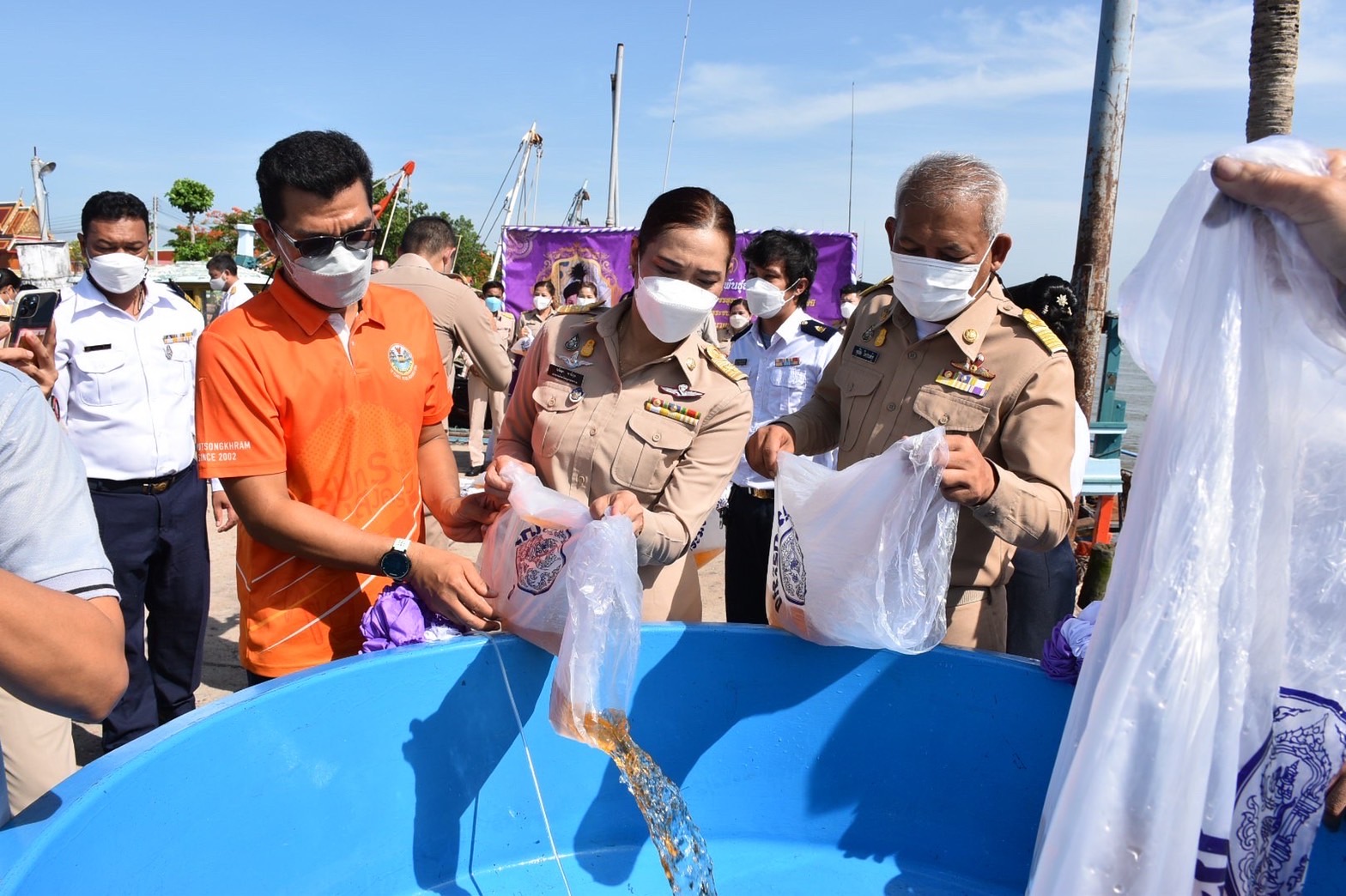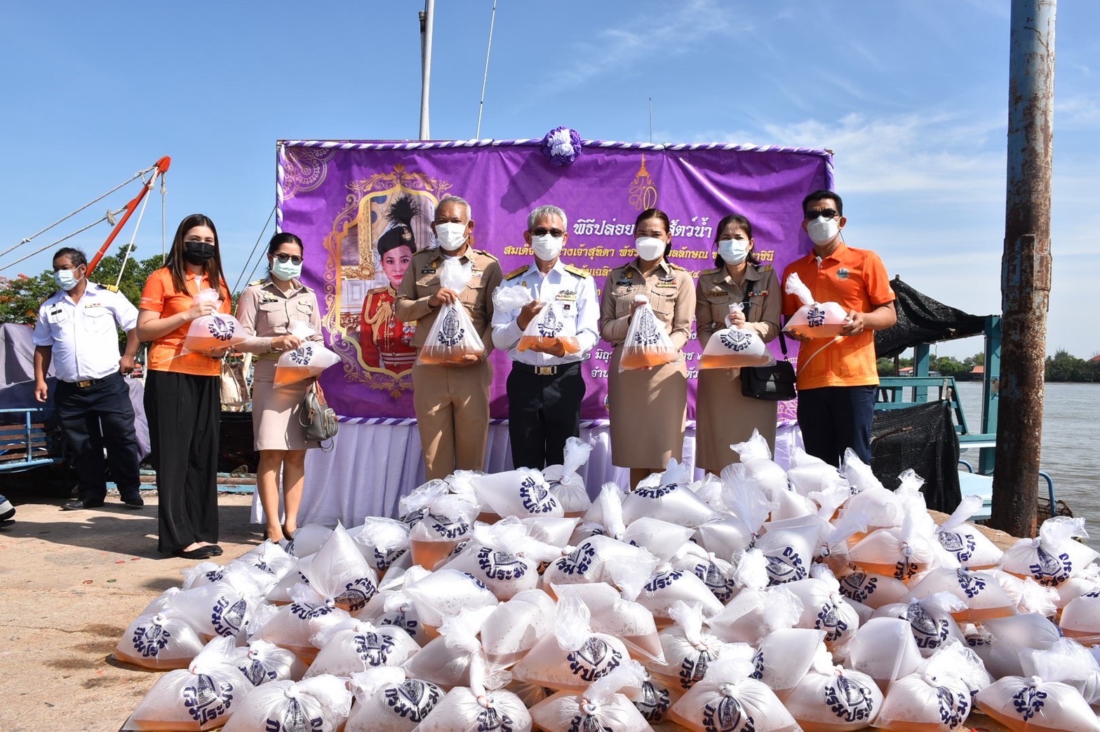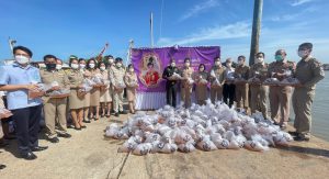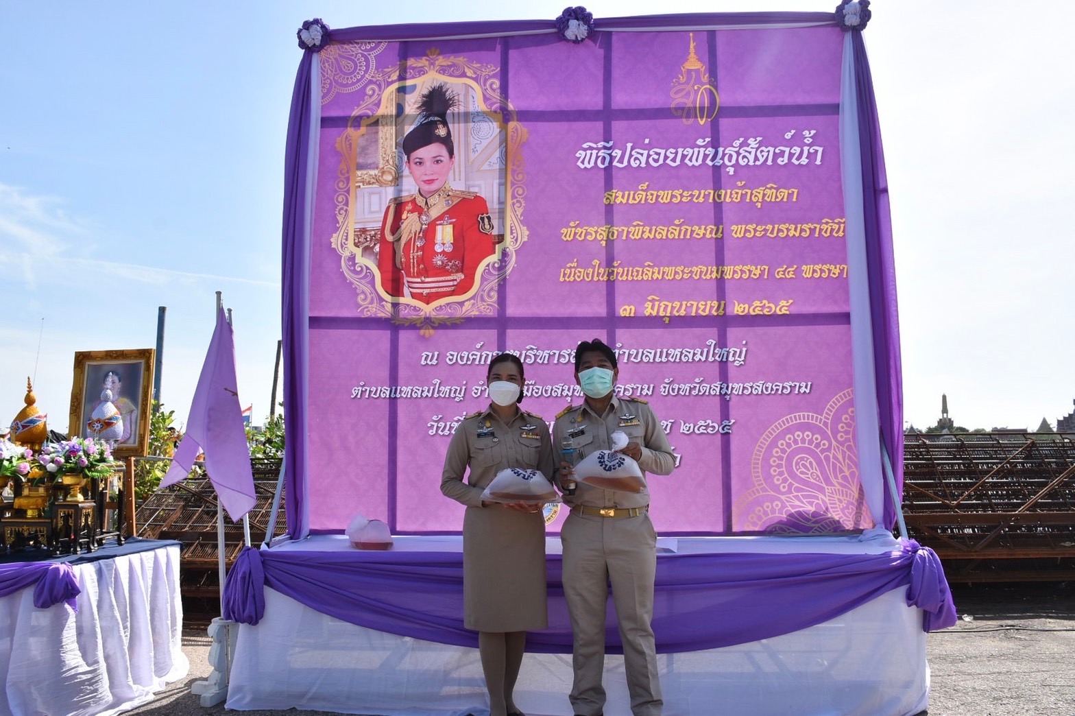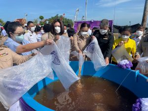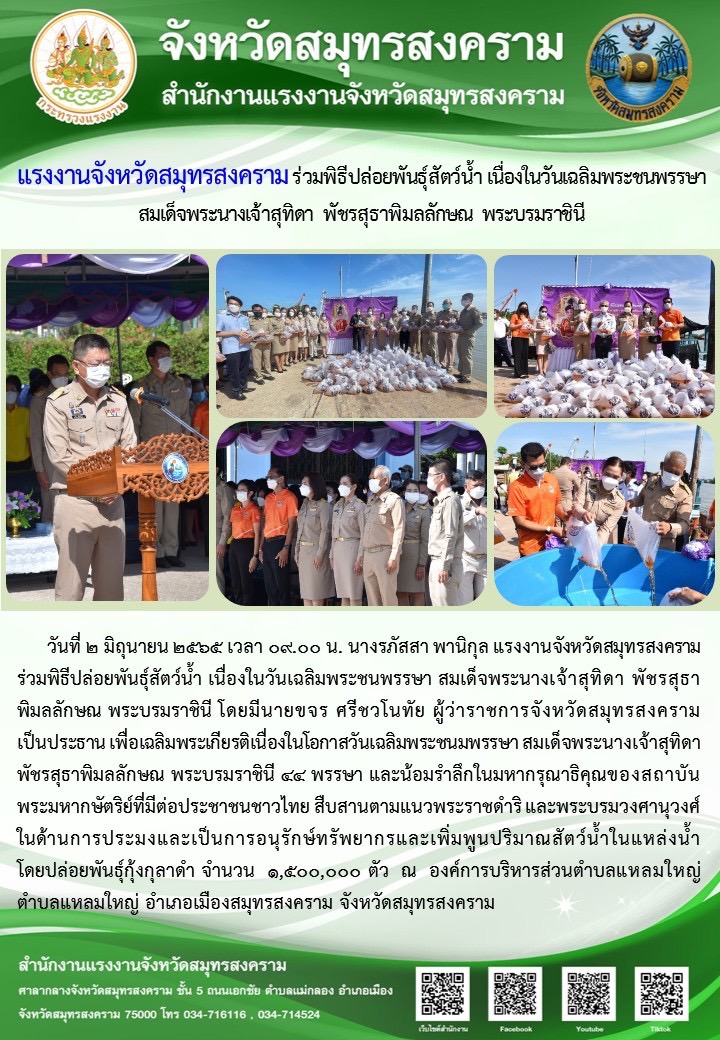 วันที่ 2 มิถุนายน 2565 เวลา 09.00 น. นางรภัสสา พานิกุล แรงงานจังหวัดสมุทรสงคราม ร่วมพิธีปล่อยพันธุ์สัตว์น้ำ เนื่องในวันเฉลิมพระชนพรรษา สมเด็จพระนางเจ้าสุทิดา พัชรสุธาพิมลลักษณ พระบรมราชินี โดยมีนายขจร ศรีชวโนทัย ผู้ว่าราชการจังหวัดสมุทรสงคราม เป็นประธาน เพื่อเฉลิมพระเกียรติเนื่องในโอกาสวันเฉลิมพระชนมพรรษา สมเด็จพระนางเจ้าสุทิดา พัชรสุธาพิมลลักษณ พระบรมราชินี 44 พรรษา และน้อมรำลึกในมหากรุณาธิคุณของสถาบันพระมหากษัตริย์ที่มีต่อประชาชนชาวไทย สืบสานตามแนวพระราชดำริ และพระบรมวงศานุวงศ์ในด้านการประมงและเป็นการอนุรักษ์ทรัพยากรและเพิ่มพูนปริมาณสัตว์น้ำในแหล่งน้ำ โดยปล่อยพันธุ์กุ้งกุลาดำ จำนวน 1,500,000 ตัว ณ องค์การบริหารส่วนตำบลแหลมใหญ่ ตำบลแหลมใหญ่ อำเภอเมืองสมุทรสงคราม จังหวัดสมุทรสงคราม