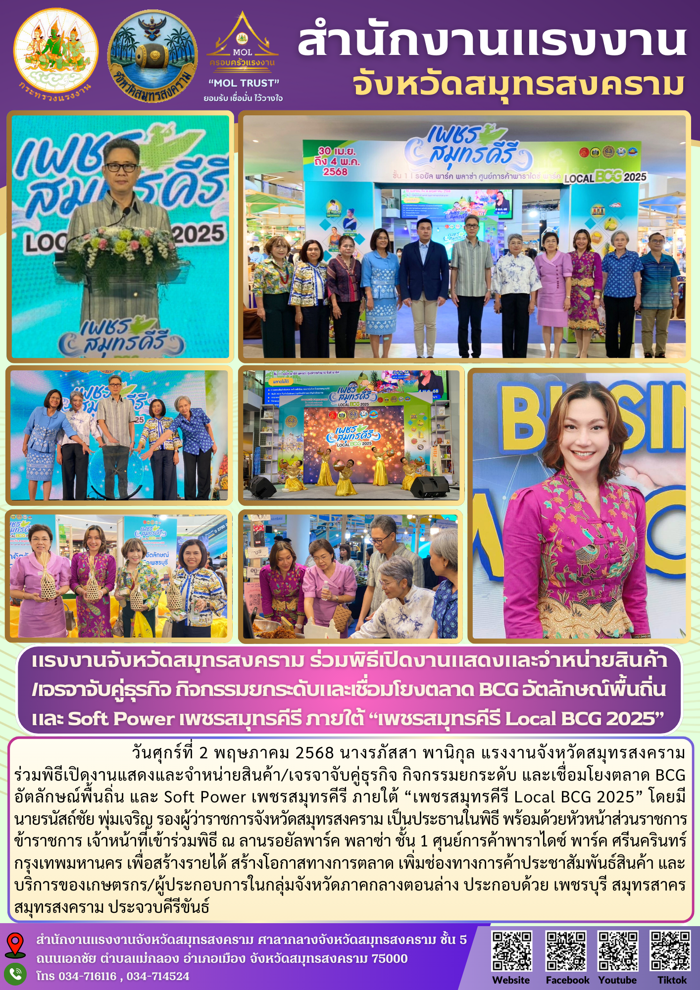 วันศุกร์ที่ 2 พฤษภาคม 2568 เวลา 14.30 น. นางรภัสสา พานิกุล แรงงานจังหวัดสมุทรสงคราม ร่วมพิธีเปิดงานแสดงและจำหน่ายสินค้า/เจรจาจับคู่ธุรกิจ กิจกรรมยกระดับ และเชื่อมโยงตลาด BCG อัตลักษณ์พื้นถิ่น และ Soft Power เพชรสมุทรคีรี ภายใต้ “เพชรสมุทรคีรี Local BCG 2025” โดยมี นายรนัสถ์ชัย พุ่มเจริญ รองผู้ว่าราชการจังหวัดสมุทรสงคราม เป็นประธานในพิธี พร้อมด้วยหัวหน้าส่วนราชการ ข้าราชการ เจ้าหน้าที่เข้าร่วมพิธี ณ ลานรอยัลพาร์ค พลาซ่า ชั้น 1 ศุนย์การค้าพาราไดซ์ พาร์ค ศรีนครินทร์กรุงเทพมหานคร เพื่อสร้างรายได้ สร้างโอกาสทางการตลาด เพิ่มช่องทางการค้าประชาสัมพันธ์สินค้า และบริการของเกษตรกร/ผู้ประกอบการในกลุ่มจังหวัดภาคกลางตอนล่าง ประกอบด้วย เพชรบุรี สมุทรสาคร สมุทรสงคราม ประจวบคีรีขันธ์