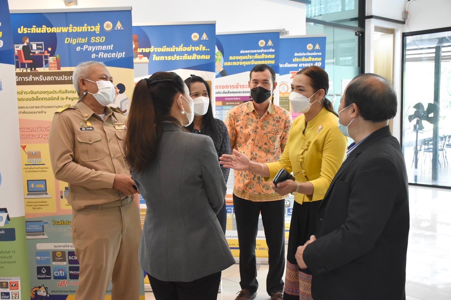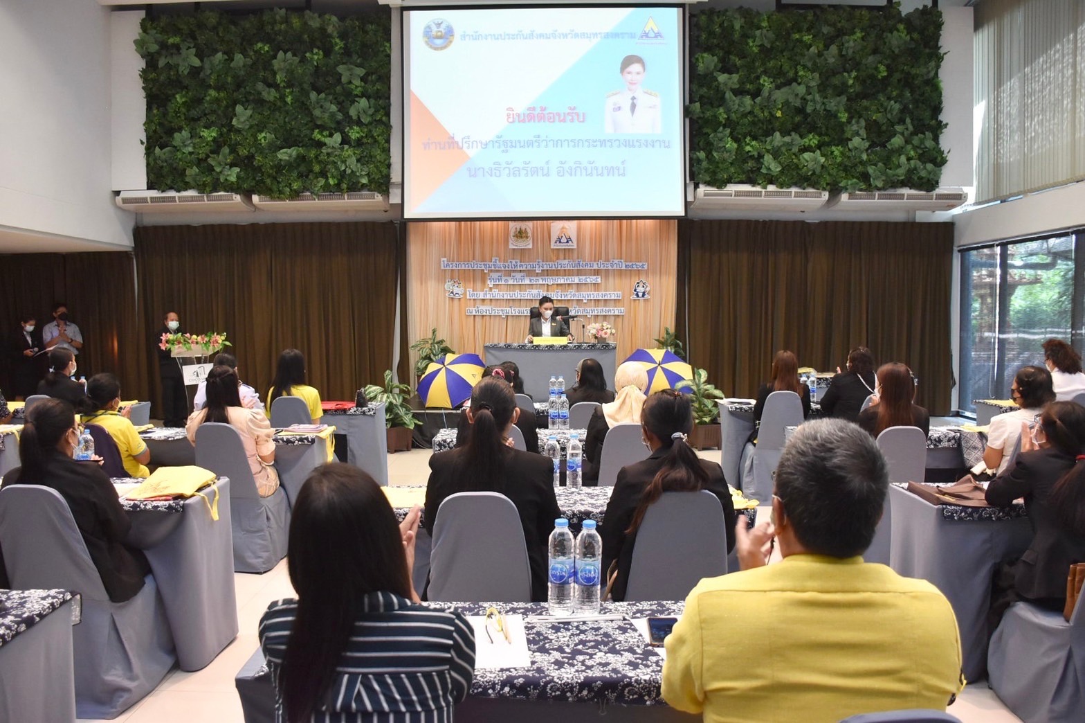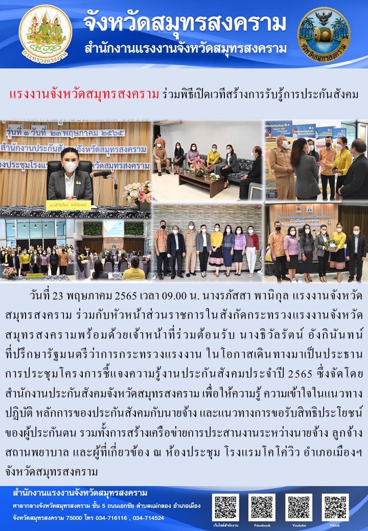 วันที่ 23 พฤษภาคม 2565 เวลา 09.00 น. นางรภัสสา พานิกุล แรงงานจังหวัดสมุทรสงคราม ร่วมกับหัวหน้าส่วนราชการในสังกัดกระทรวงแรงงานจังหวัดสมุทรสงครามพร้อมด้วยเจ้าหน้าที่ร่วมต้อนรับ นางธิวัลรัตน์ อังกินันทน์ ที่ปรึกษารัฐมนตรีว่าการกระทรวงแรงงาน ในโอกาสเดินทางมาเป็นประธาน การประชุมโครงการชี้แจงความรู้งานประกันสังคมประจำปี 2565 ซึ่งจัดโดยสำนักงานประกันสังคมจังหวัดสมุทรสงคราม เพื่อให้ความรู้ ความเข้าใจในแนวทางปฏิบัติ หลักการของประกันสังคมกับนายจ้าง และแนวทางการขอรับสิทธิประโยชน์ของผู้ประกันตน รวมทั้งการสร้างเครือข่ายการประสานงานระหว่างนายจ้าง ลูกจ้าง สถานพยาบาล และผู้ที่เกี่ยวข้อง ณ ห้องประชุม โรงแรมโคโค่วิว อำเภอเมืองฯ จังหวัดสมุทรสงคราม