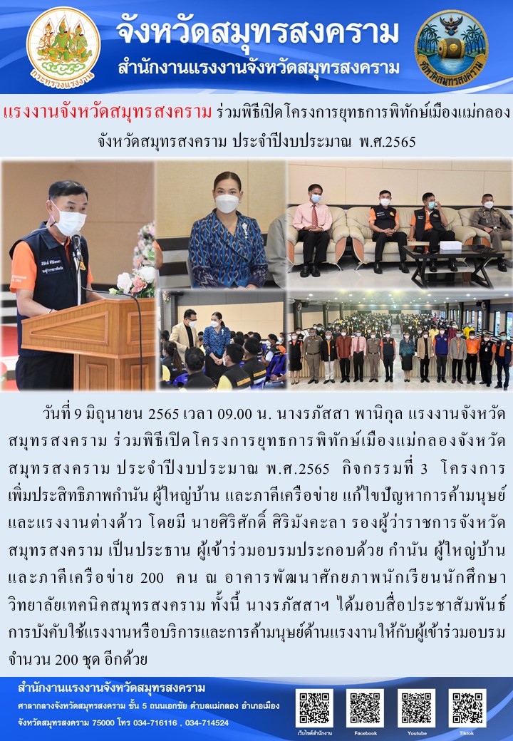 วันที่ 9 มิถุนายน 2565 เวลา 09.00 น. นางรภัสสา พานิกุล แรงงานจังหวัดสมุทรสงคราม ร่วมพิธีเปิดโครงการยุทธการพิทักษ์เมืองแม่กลองจังหวัดสมุทรสงคราม ประจำปีงบประมาณ พ.ศ.2565 กิจกรรมที่ 3 โครงการเพิ่มประสิทธิภาพกำนัน ผู้ใหญ่บ้าน และภาคีเครือข่าย แก้ไขปัญหาการค้ามนุษย์และแรงงานต่างด้าว โดยมี นายศิริศักดิ์ ศิริมังคะลา รองผู้ว่าราชการจังหวัดสมุทรสงคราม เป็นประธาน ผู้เข้าร่วมอบรมประกอบด้วย กำนัน ผู้ใหญ่บ้าน และภาคีเครือข่าย 200 คน ณ อาคารพัฒนาศักยภาพนักเรียนนักศึกษา วิทยาลัยเทคนิคสมุทรสงคราม ทั้งนี้ นางรภัสสาฯ ได้มอบสื่อประชาสัมพันธ์การบังคับใช้แรงงานหรือบริการและการค้ามนุษย์ด้านแรงงานให้กับผู้เข้าร่วมอบรม จำนวน 200 ชุด อีกด้วย