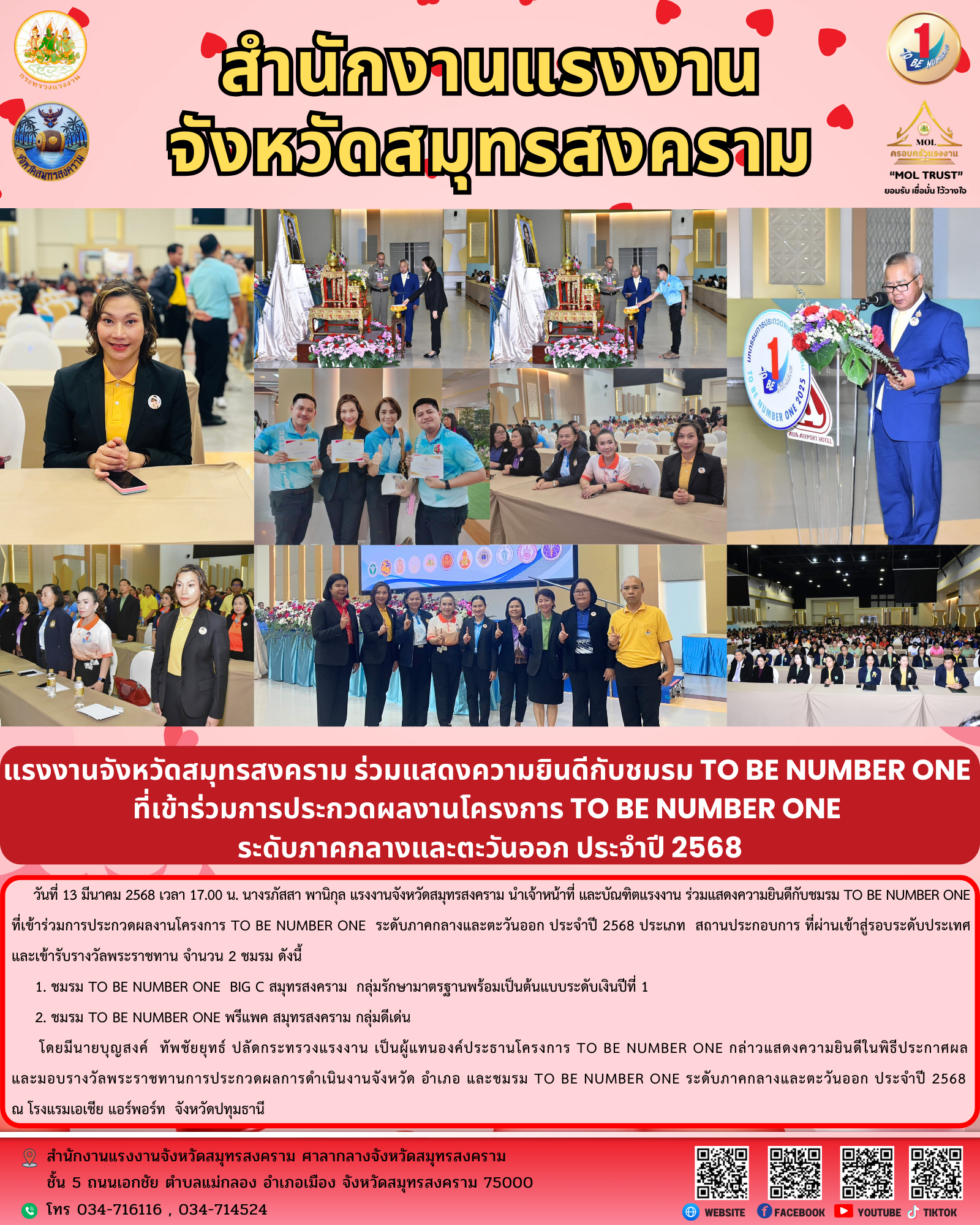 วันที่ 13 มีนาคม 2568 เวลา 17.00 น. นางรภัสสา พานิกุล แรงงานจังหวัดสมุทรสงคราม นำเจ้าหน้าที่ และบัณฑิตแรงงาน ร่วมแสดงความยินดีกับชมรม TO BE NUMBER ONE ที่เข้าร่วมการประกวดผลงานโครงการ TO BE NUMBER ONE ระดับภาคกลางและตะวันออก ประจำปี 2568 ประเภทสถานประกอบการ ที่ผ่านเข้าสู่รอบระดับประเทศ และเข้ารับรางวัลพระราชทาน จำนวน 2 ชมรม ดังนี้