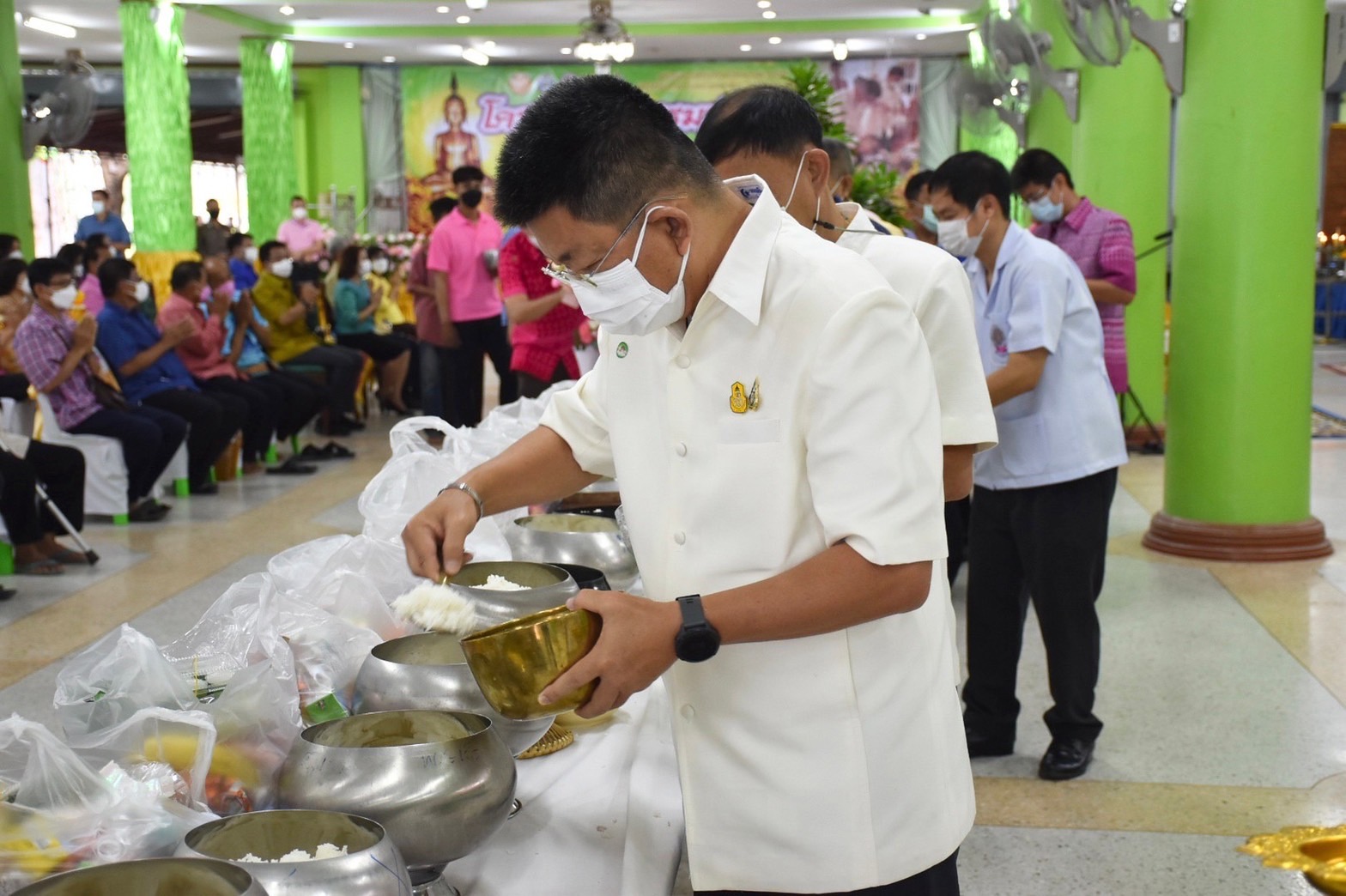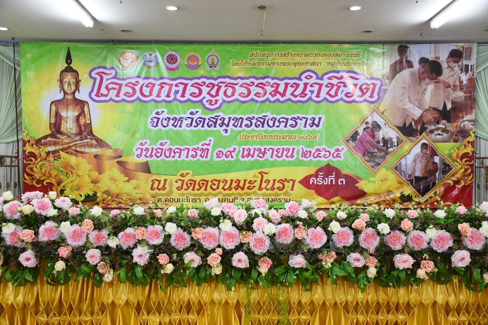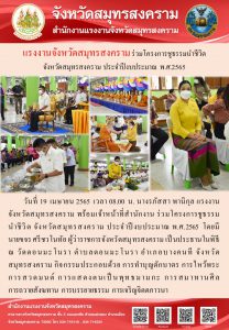 วันที่ 19 เมษายน 2565 เวลา 08.00 น. นางรภัสสา พานิกุล แรงงานจังหวัดสมุทรสงคราม พร้อมเจ้าหน้าที่สำนักงาน ร่วมโครงการชูธรรมนำชีวิต จังหวัดสมุทรสงคราม ประจำปีงบประมาณ พ.ศ.2565 โดยมี นายขจร ศรีชวโนทัย ผู้ว่าราชการจังหวัดสมุทรสงคราม เป็นประธานในพิธี ณ วัดดอนมะโนรา ตำบลดอนมะโนรา อำเภอบางคนที จังหวัดสมุทรสงคราม กิจกรรมประกอบด้วย การทำบุญตักบาตร การไหว้พระ การสวดมนต์ การแสดงตนเป็นพุทธมามกะ การสมาทานศีล การถวายสังฆทาน การบรรยายธรรม การเจริญจิตตภาวนา