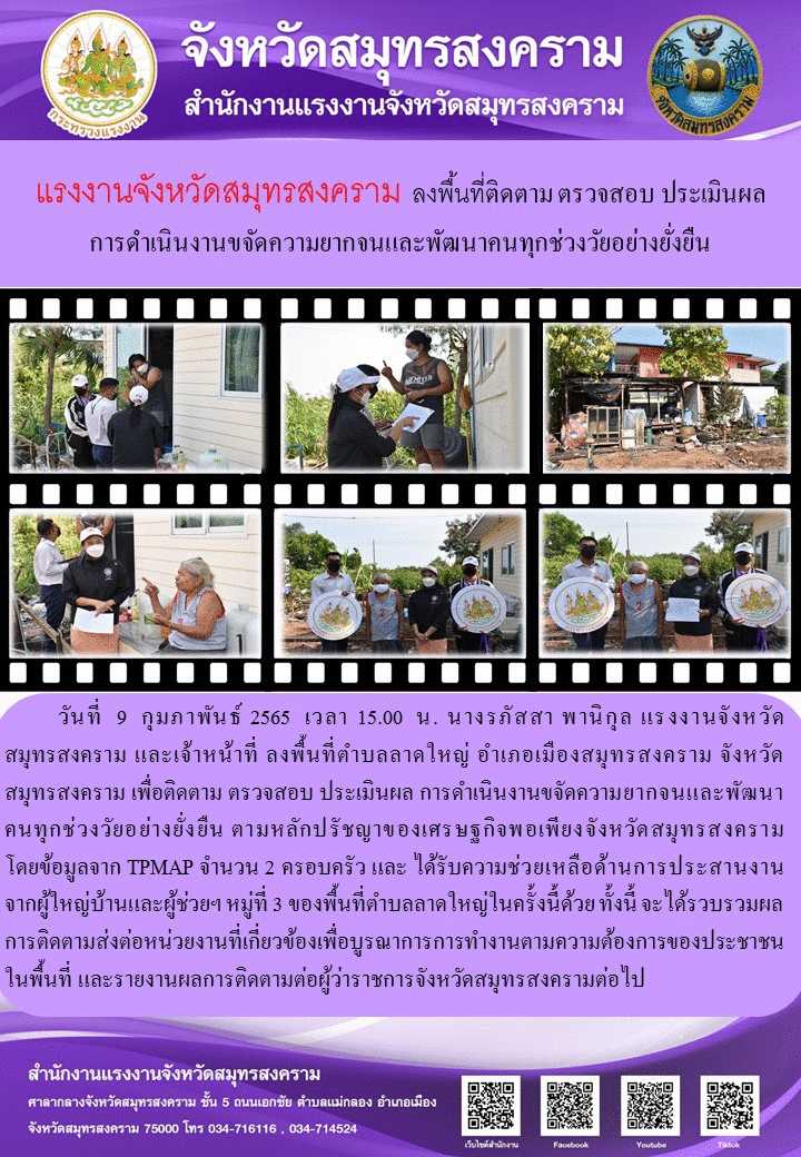 วันที่ 9 กุมภาพันธ์ 2565 เวลา 15.00 น. นางรภัสสา พานิกุล แรงงานจังหวัดสมุทรสงคราม และเจ้าหน้าที่ ลงพื้นที่ตำบลลาดใหญ่ อำเภอเมืองสมุทรสงคราม จังหวัดสมุทรสงคราม เพื่อติดตาม ตรวจสอบ ประเมินผล การดำเนินงานขจัดความยากจนและพัฒนาคนทุกช่วงวัยอย่างยั่งยืน ตามหลักปรัชญาของเศรษฐกิจพอเพียงจังหวัดสมุทรสงคราม โดยข้อมูลจาก TPMAP จำนวน 2 ครอบครัว และ ได้รับความช่วยเหลือด้านการประสานงานจากผู้ใหญ่บ้านและผู้ช่วยฯ หมู่ที่ 3 ของพื้นที่ตำบลลาดใหญ่ในครั้งนี้ด้วย ทั้งนี้ จะได้รวบรวมผลการติดตามส่งต่อหน่วยงานที่เกี่ยวข้องเพื่อบูรณาการการทำงานตามความต้องการของประชาชนในพื้นที่ และรายงานผลการติดตามต่อผู้ว่าราชการจังหวัดสมุทรสงครามต่อไป