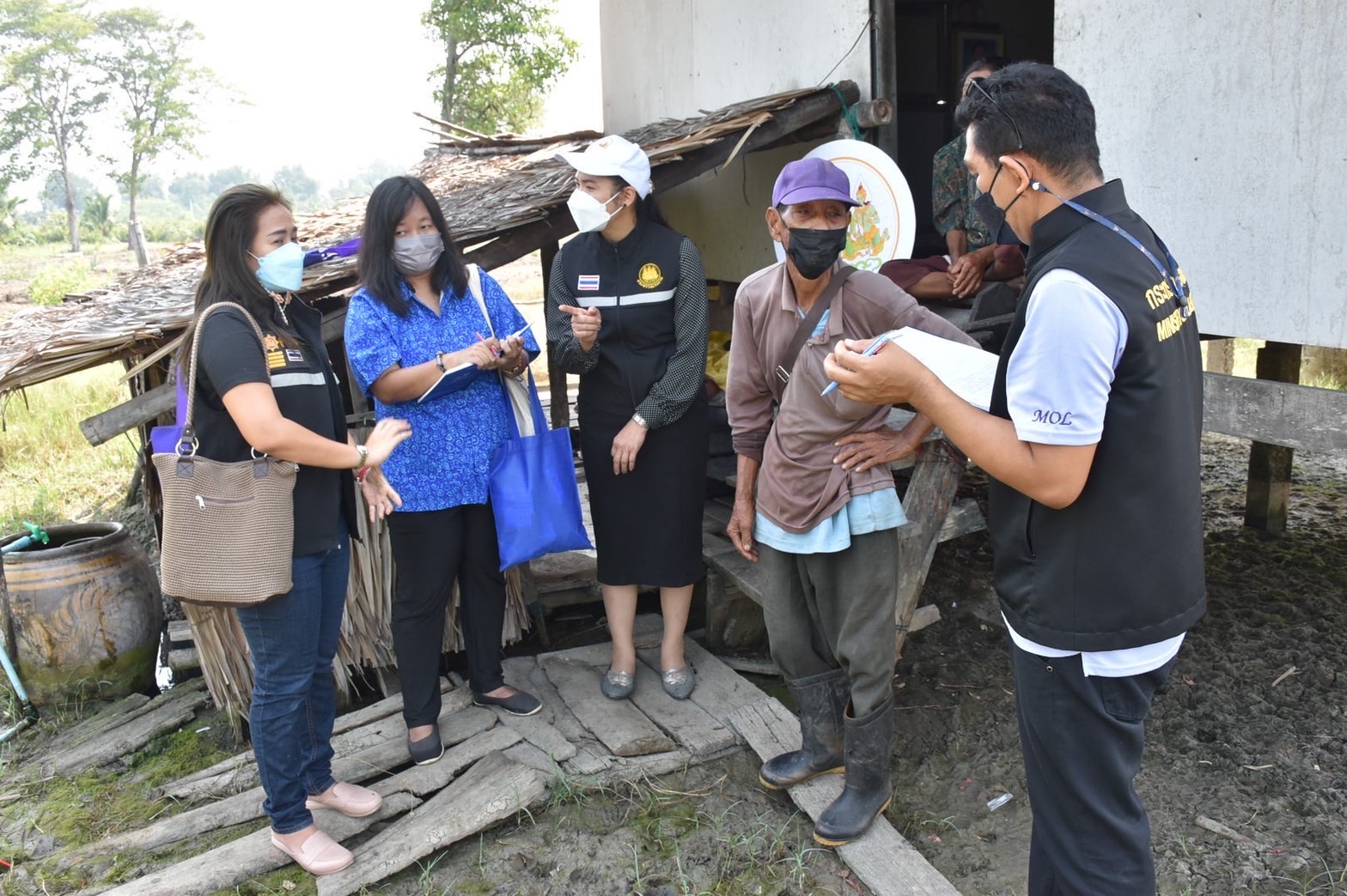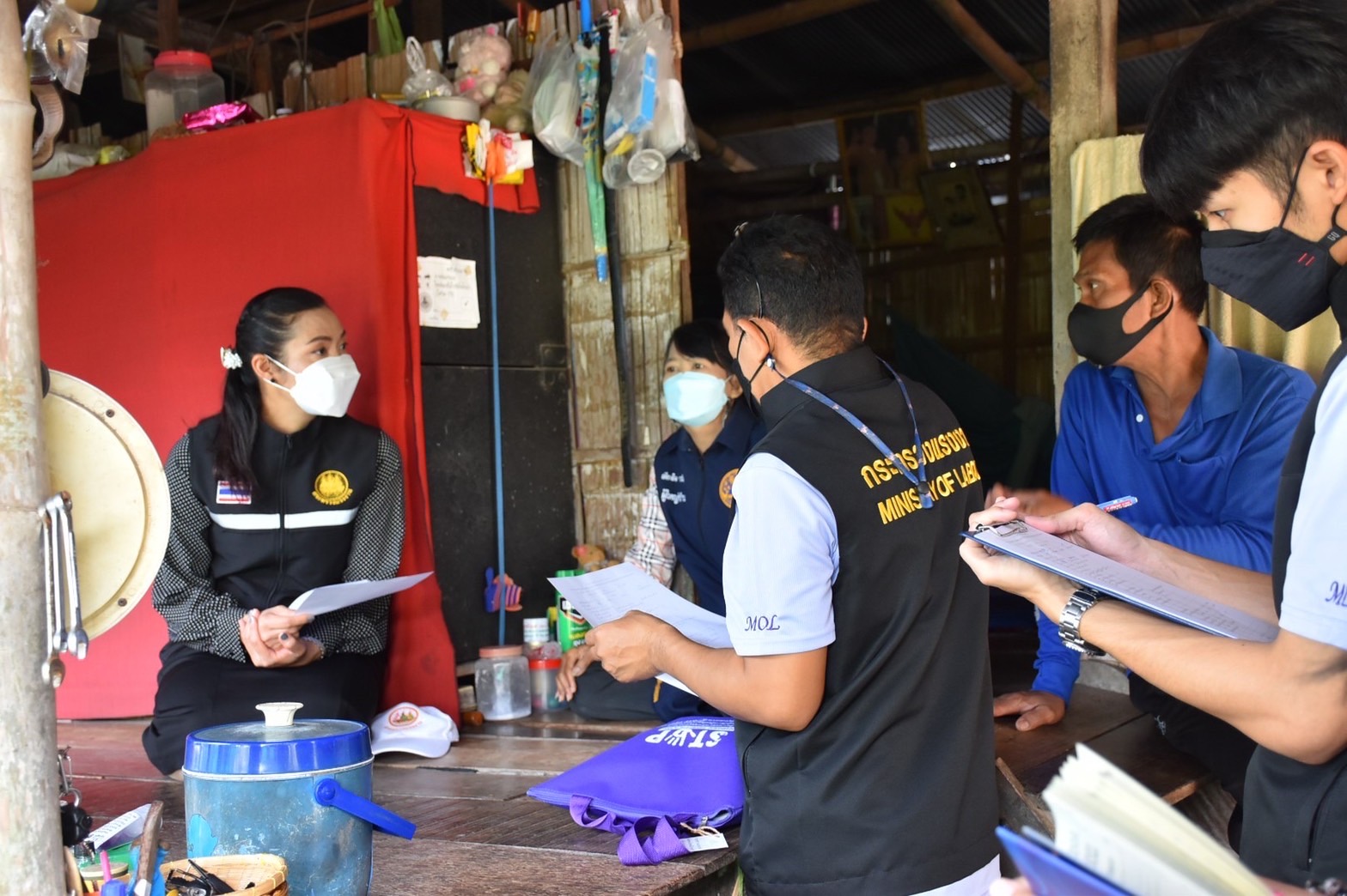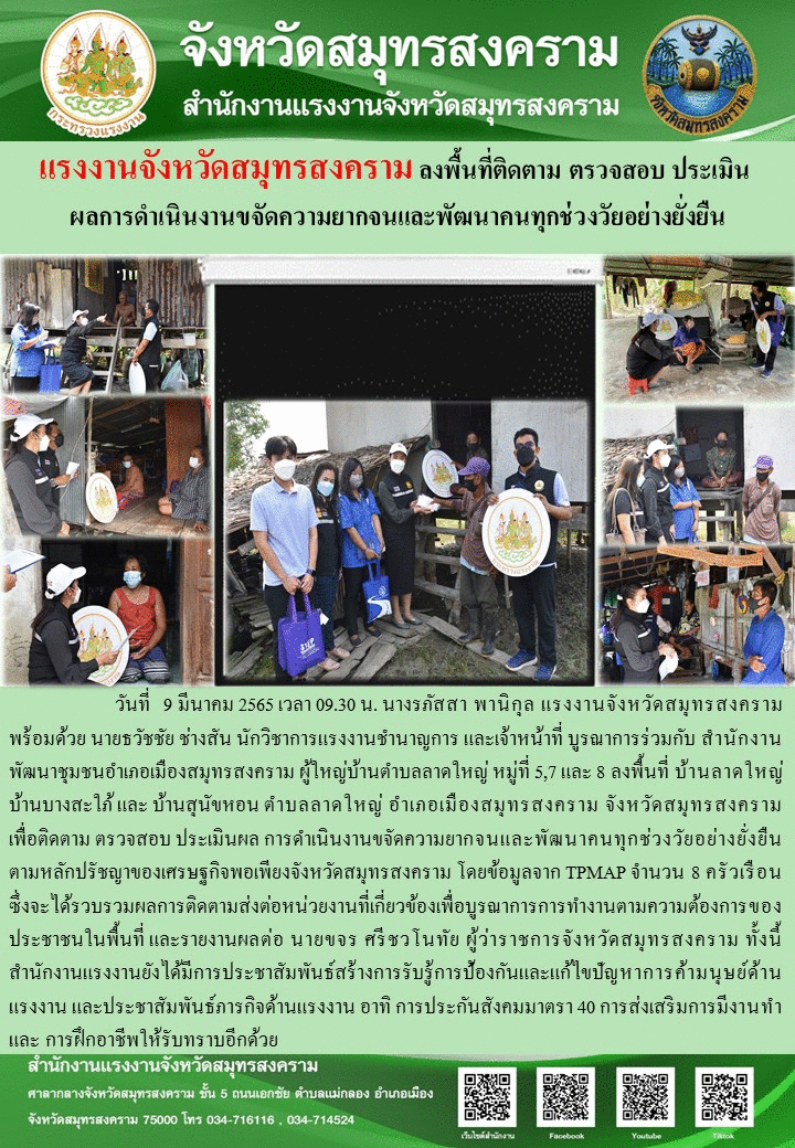 วันที่ 9 มีนาคม 2565 เวลา 09.30 น. นางรภัสสา พานิกุล แรงงานจังหวัดสมุทรสงคราม พร้อมด้วย นายธวัชชัย ช่างสัน นักวิชาการแรงงานชำนาญการ และเจ้าหน้าที่ บูรณาการร่วมกับ สำนักงานพัฒนาชุมชนอำเภอเมืองสมุทรสงคราม ผู้ใหญ่บ้านตำบลลาดใหญ่ หมู่ที่ 5,7 และ 8 ลงพื้นที่ บ้านลาดใหญ่ บ้านบางสะใภ้ และ บ้านสุนัขหอน ตำบลลาดใหญ่ อำเภอเมืองสมุทรสงคราม จังหวัดสมุทรสงคราม เพื่อติดตาม ตรวจสอบ ประเมินผล การดำเนินงานขจัดความยากจนและพัฒนาคนทุกช่วงวัยอย่างยั่งยืน ตามหลักปรัชญาของเศรษฐกิจพอเพียงจังหวัดสมุทรสงคราม โดยข้อมูลจาก TPMAP จำนวน 8 ครัวเรือน ซึ่งจะได้รวบรวมผลการติดตามส่งต่อหน่วยงานที่เกี่ยวข้องเพื่อบูรณาการการทำงานตามความต้องการของประชาชนในพื้นที่ และรายงานผลต่อ นายขจร ศรีชวโนทัย ผู้ว่าราชการจังหวัดสมุทรสงคราม ทั้งนี้ สำนักงานแรงงานยังได้มีการประชาสัมพันธ์สร้างการรับรู้การป้องกันและแก้ไขปัญหาการค้ามนุษย์ด้านแรงงาน และประชาสัมพันธ์ภารกิจด้านแรงงาน อาทิ การประกันสังคมมาตรา 40 การส่งเสริมการมีงานทำ และ การฝึกอาชีพให้รับทราบอีกด้วย