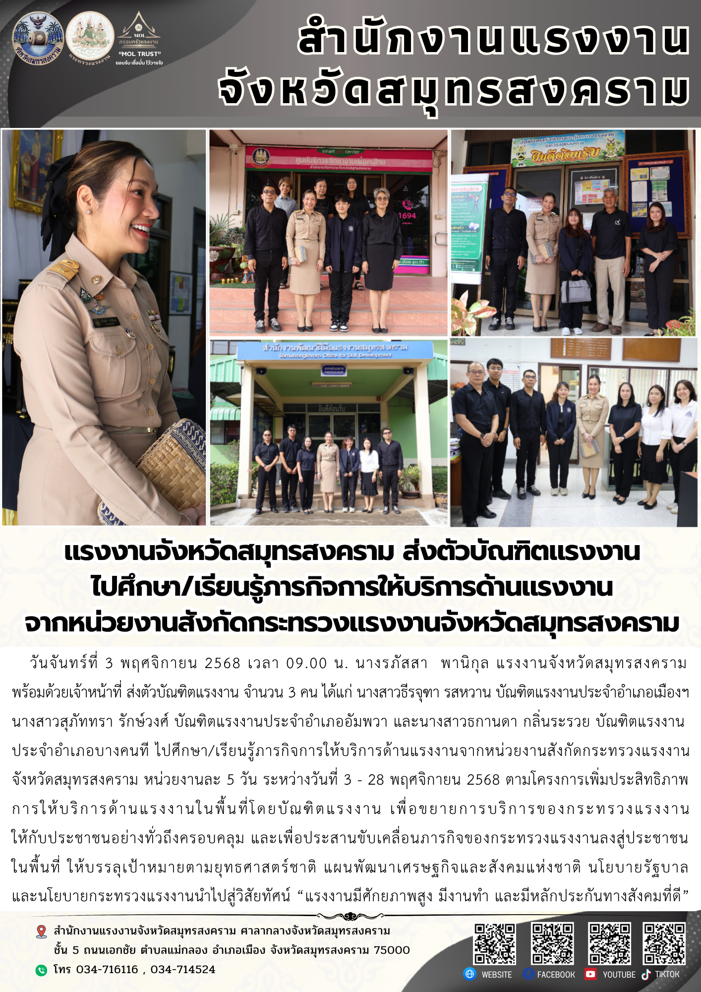 วันจันทร์ที่ 3 พฤศจิกายน 2568 เวลา 09.00 น. นางรภัสสา พานิกุล แรงงานจังหวัดสมุทรสงคราม