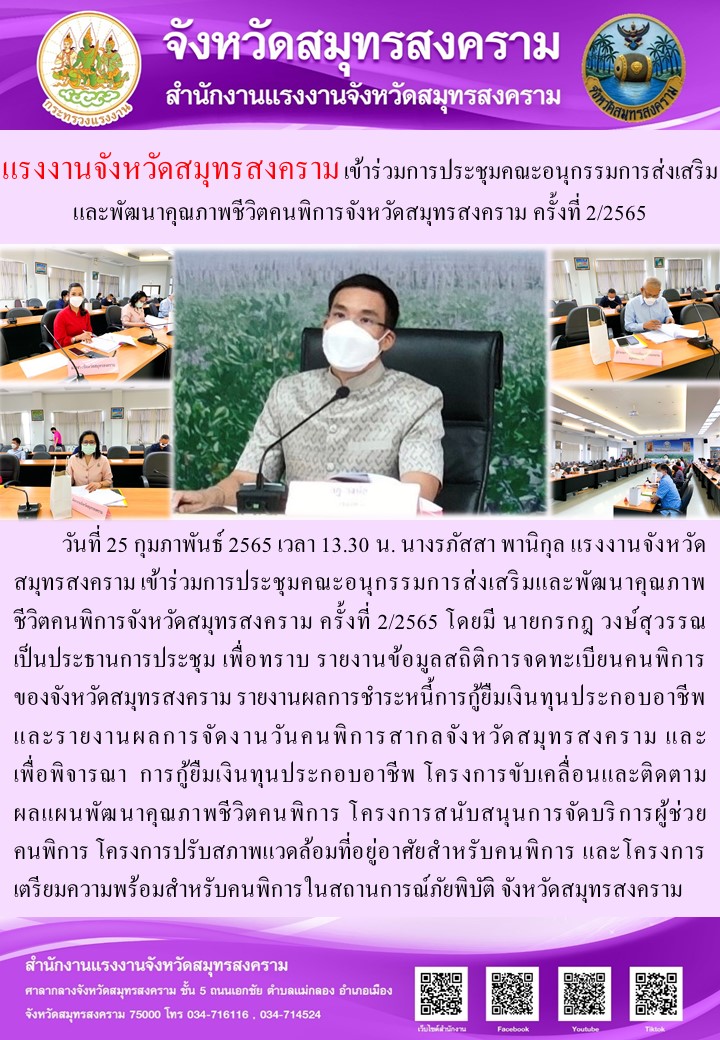 วันที่ 25 กุมภาพันธ์ 2565 เวลา 13.30 น. นางรภัสสา พานิกุล แรงงานจังหวัดสมุทรสงคราม เข้าร่วมการประชุมคณะอนุกรรมการส่งเสริมและพัฒนาคุณภาพชีวิตคนพิการจังหวัดสมุทรสงคราม ครั้งที่ 2/2565 โดยมี นายกรกฎ วงษ์สุวรรณ เป็นประธานการประชุม เพื่อทราบ รายงานข้อมูลสถิติการจดทะเบียนคนพิการของจังหวัดสมุทรสงคราม รายงานผลการชำระหนี้การกู้ยืมเงินทุนประกอบอาชีพ และรายงานผลการจัดงานวันคนพิการสากลจังหวัดสมุทรสงคราม และเพื่อพิจารณา การกู้ยืมเงินทุนประกอบอาชีพ โครงการขับเคลื่อนและติดตามผลแผนพัฒนาคุณภาพชีวิตคนพิการ โครงการสนับสนุนการจัดบริการผู้ช่วยคนพิการ โครงการปรับสภาพแวดล้อมที่อยู่อาศัยสำหรับคนพิการ และโครงการเตรียมความพร้อมสำหรับคนพิการในสถานการณ์ภัยพิบัติ จังหวัดสมุทรสงคราม