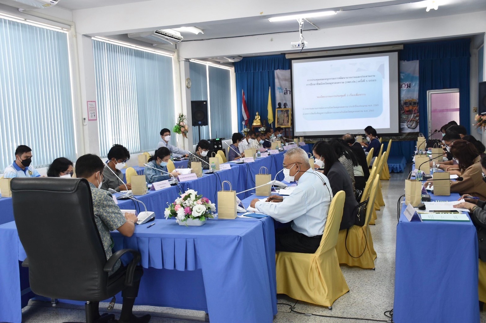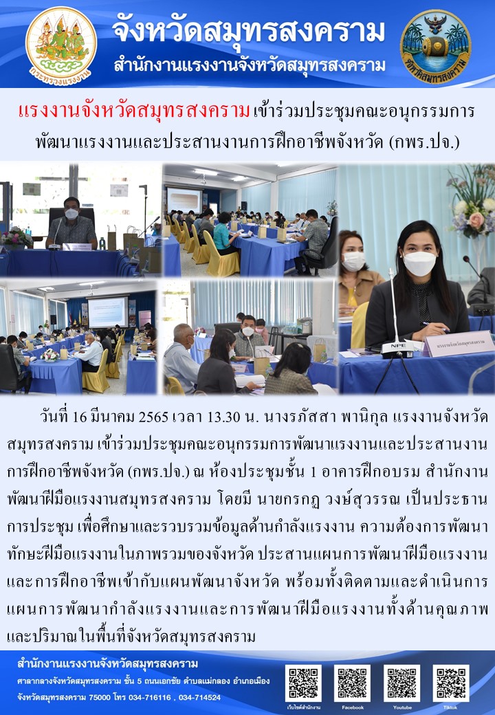 วันที่ 16 มีนาคม 2565 เวลา 13.30 น. นางรภัสสา พานิกุล แรงงานจังหวัดสมุทรสงคราม เข้าร่วมประชุมคณะอนุกรรมการพัฒนาแรงงานและประสานงานการฝึกอาชีพจังหวัด (กพร.ปจ.) ณ ห้องประชุมชั้น 1 อาคารฝึกอบรม สำนักงานพัฒนาฝีมือแรงงานสมุทรสงคราม โดยมี นายกรกฏ วงษ์สุวรรณ เป็นประธานการประชุม เพื่อศึกษาและรวบรวมข้อมูลด้านกำลังแรงงาน ความต้องการพัฒนาทักษะฝีมือแรงงานในภาพรวมของจังหวัด ประสานแผนการพัฒนาฝีมือแรงงานและการฝึกอาชีพเข้ากับแผนพัฒนาจังหวัด พร้อมทั้งติดตามและดำเนินการแผนการพัฒนากำลังแรงงานและการพัฒนาฝีมือแรงงานทั้งด้านคุณภาพและปริมาณในพื้นที่จังหวัดสมุทรสงคราม