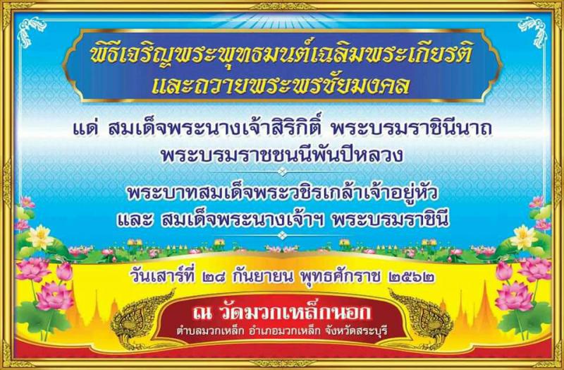 วันที่ 28 กันยายน 2562 เวลา 14.00 น. นางสาวรัตนา ทองกลับ แรงงานจังหวัดสระบุรี มอบหมายให้นางสาวมัทนาวดี ภมรมานพ เจ้าพนักงานการเงินและบัญชีปฏิบัติงาน พร้อมนางสาวจันทิรา เพ็ชรพราว เจ้าหน้าที่บริการ ร่วมพิธีเจริญพระพุทธมนต์ถวายพระพรชัยมงคลแด่ สมเด็จพระนางเจ้าสิริกิติ์ พระบรมราชินีนาถ พระบรมราชชนนีพันปีหลวง พระบาทสมเด็จพระวชิรเกล้าเจ้าอยู่หัว และสมเด็จพระนางเจ้า ฯ พระบรมราชินี ประจำปีพุทธศักราช 2562 ครั้งที่ 9 ณ วัดมวกเหล็กนอก ตำบลมวกเหล็ก อำเภอมวกเหล็ก จังหวัดสระบุรี โดยมีนายสมภพ สมิตะสิริ รองผู้ว่าราชการจังหวัดสระบุรี เป็นประธานในพิธี