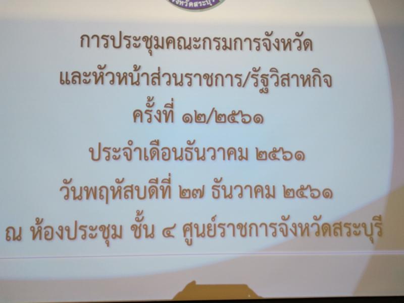 วันที่ 27 ธันวาคม 2561 นางสาวรัตนา ทองกลับ แรงงานจังหวัดสระบุรี หัวหน้าส่วนราชการสังกัด ร่วมประชุมกิจกรรมของจังหวัดสระบุรี โดยมีนายแมนรัตน์ รัตนสุคนธ์ ผู้ว่าราชการจังหวัดสระบุรี เป็นประธาน ประกอบด้วย
