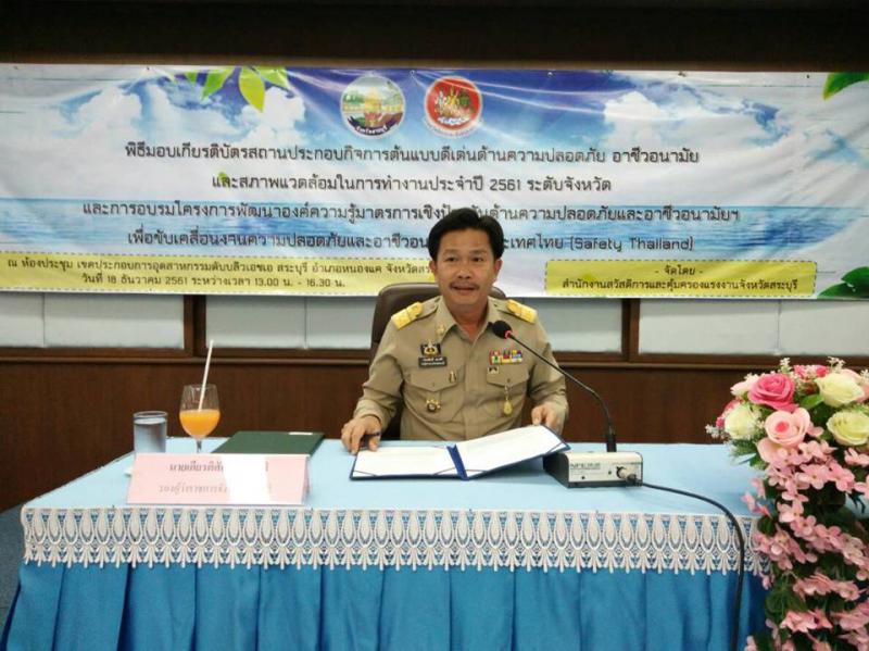 วันที่ 18 ธันวาคม 2561 เวลา 13.45 น. ณ ห้องประชุมเขตประกอบการอุตสาหกรรม ดับบลิวเอชเอ (WHA) นิคมอุตสาหกรรมเหมราช นางสาวรัตนา ทองกลับ แรงงานจังหวัดสระบุรี หัวหน้าส่วนร่วมราชการและเจ้าหน้าที่สังกัดกระทรวงแรงงานจังหวัดสระบุรี ร่วมเป็นเกียรติในพิธีเปิดการอบรมโครงการพัฒนาองค์ความรู้มาตรการเชิงป้องกัน ด้านความปลอดภัยและอาชีวอนามัยแก่บุคลากรที่ปฏิบัติงานด้านความปลอดภัย แลอาชีวอนามัยในสถานประกอบการ เพื่อขับเคลื่อนงานความปลอดภัย และอาชีวอนามัยของประเทศไทย (Safety Thailand) โดยมีผู้เข้าร่วมอบรม จำนวน 60 คน และพิธีมอบรางวัล เกียรติบัตรสถานประกอบการต้นแบบดีเด่นด้านความปลอดภัย อาชีวอนามัย และสภาพแวดล้อมในการทำงานประจำปี 2561 ระดับจังหวัด จำนวน 5 แห่ง โดยมี นายเกียรติศักดิ์ ตรงศิริ รองผู้ว่าราชการจังหวัดสระบุรี เป็นประธานในพิธีเปิดการอบรมและมอบเกียรติบัตรดังกล่าว จัดโดยสำนักงานสวัสการและคุ้มครองแรงงานจังหวัดสระบุรี