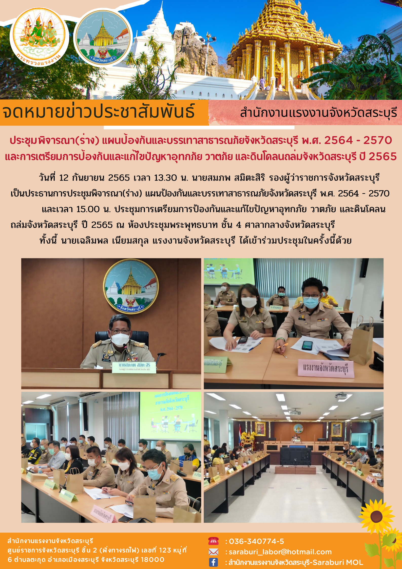 แรงงานจังหวัดสระบุรี เข้าร่วมประชุมพิจารณา(ร่าง) แผนป้องกันและบรรเทาสาธารณภัยจังหวัดสระบุรี พ.ศ. 2564 – 2570 และการเตรียมการป้องกันและแก้ไขปัญหาอุทกภัย วาตภัย และดินโคลนถล่มจังหวัดสระบุรี ปี 2565