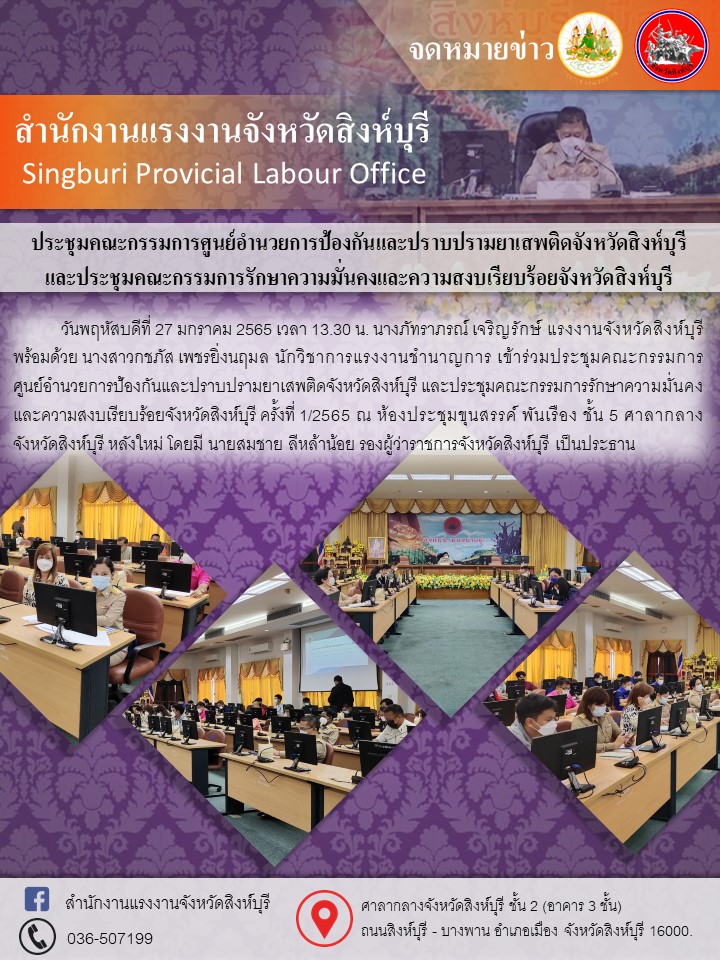 แรงงานจังหวัดสิงห์บุรี ร่วมประชุมคณะกรรมการศูนย์อำนวยการป้องกันและปราบปรามยาเสพติดจังหวัดสิงห์บุรี และประชุมคณะกรรมการรักษาความมั่นคงและความสงบเรียบร้อยจังหวัดสิงห์บุรี ครั้งที่ 1/2565