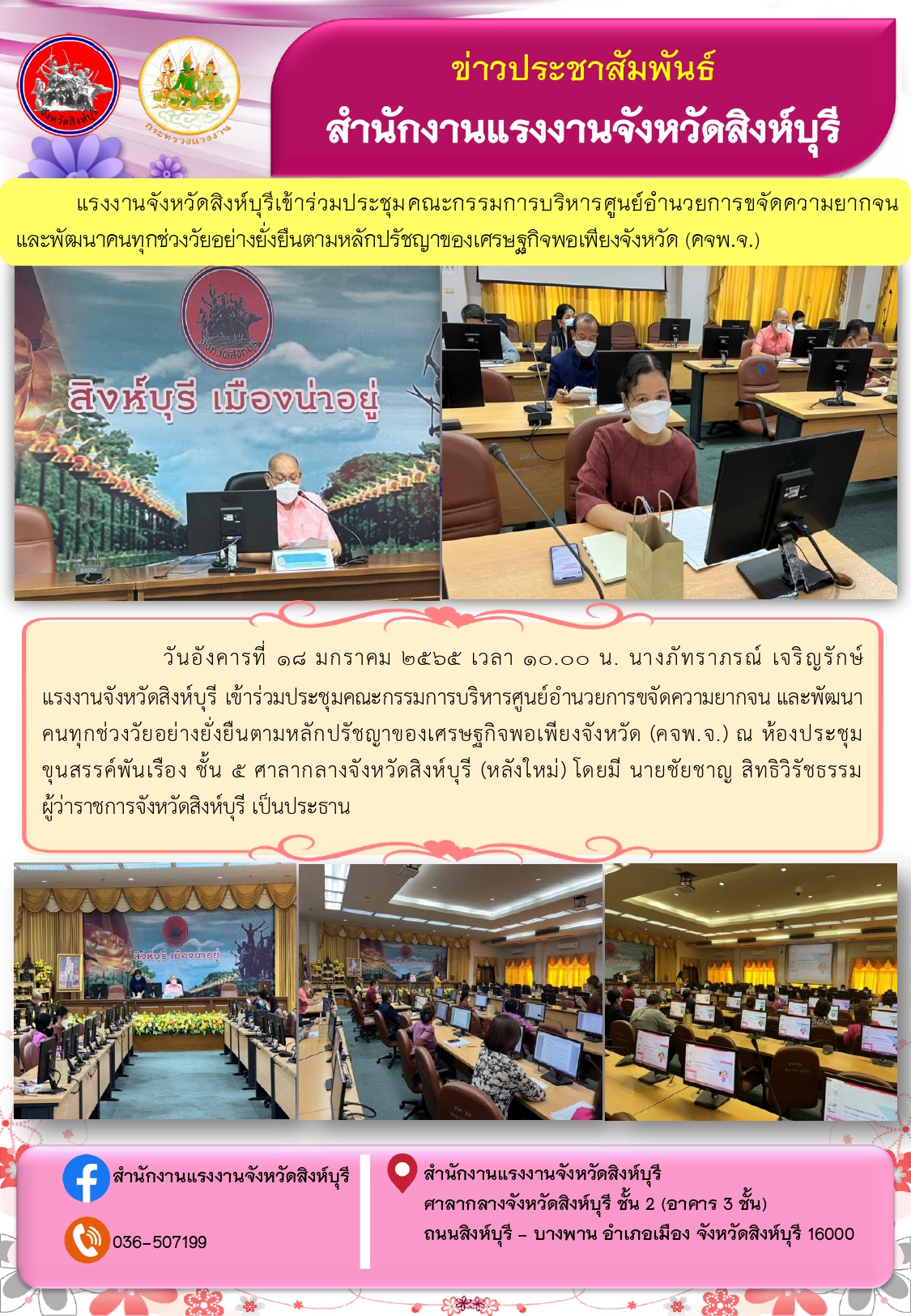 แรงงานจังหวัดสิงห์บุรีเข้าร่วมประชุมคณะกรรมการบริหารศูนย์อำนวยการขจัดความยากจนและพัฒนาคนทุกช่วงวัยอย่างยั่งยืนตามหลักปรัชญาของเศรษฐกิจพอเพียงจังหวัด (คจพ.จ.)