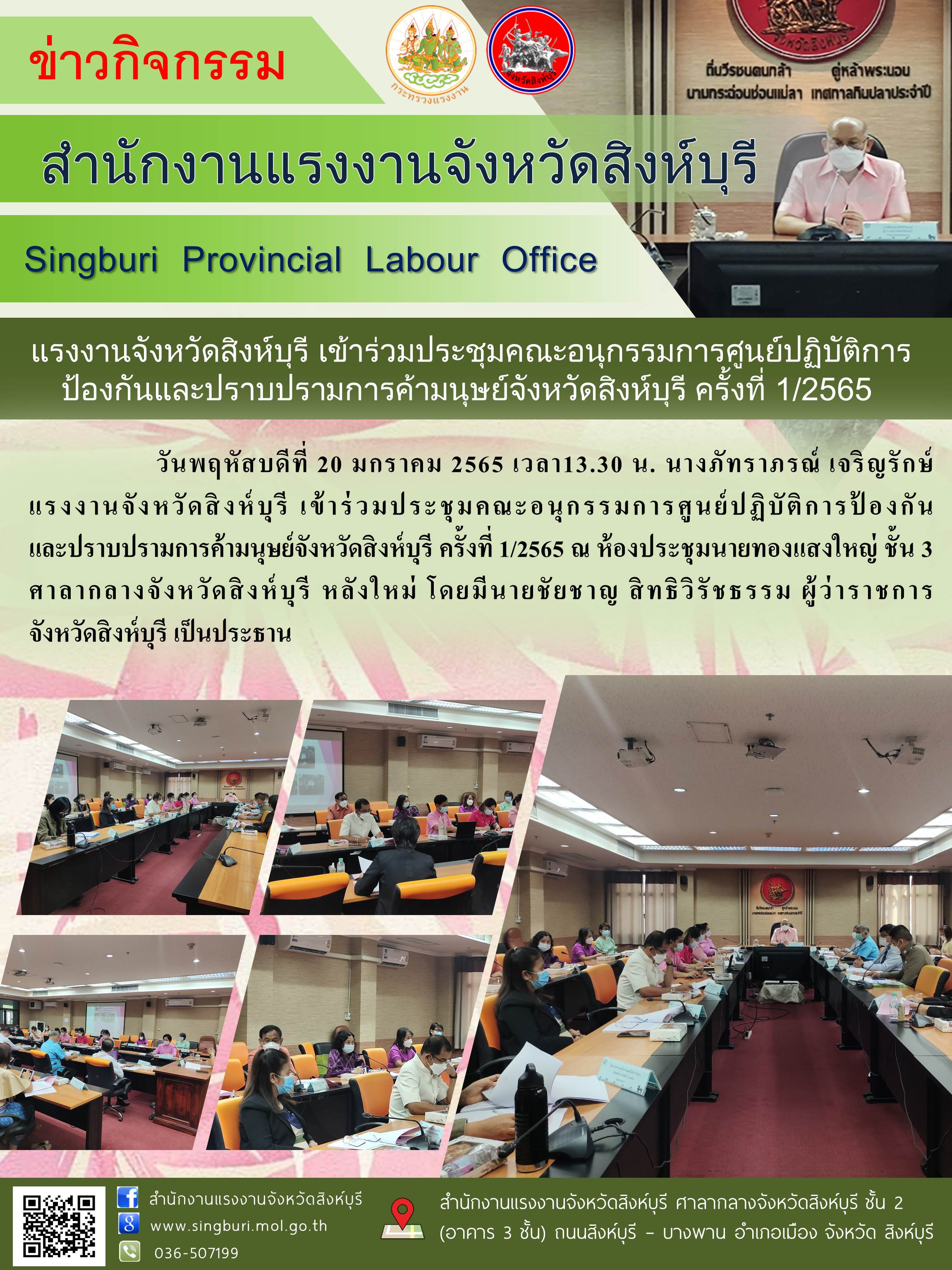 แรงงานจังหวัดสิงห์บุรี เข้าร่วมประชุมคณะอนุกรรมการศูนย์ปฏิบัติการป้องกันและปราบปรามการค้ามนุษย์จังหวัดสิงห์บุรี ครั้งที่ 1/2565