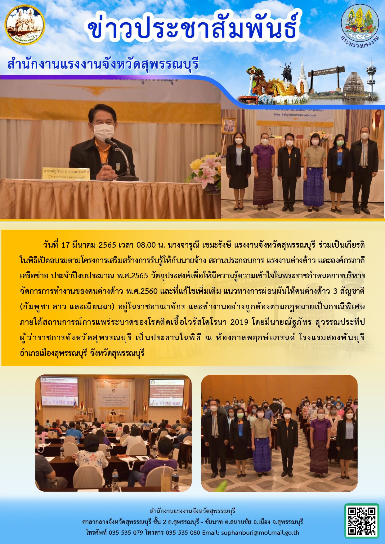 แรงงานจังหวัดสุพรรณบุรี ร่วมเป็นเกียรติ ในพิธีเปิดอบรมตามโครงการเสริมสร้างการรับรู้ให้กับนายจ้าง สถานประกอบการ แรงงานต่างด้าว และองค์กรภาคีเครือข่าย ประจำปีงบประมาณ พ.ศ.2565