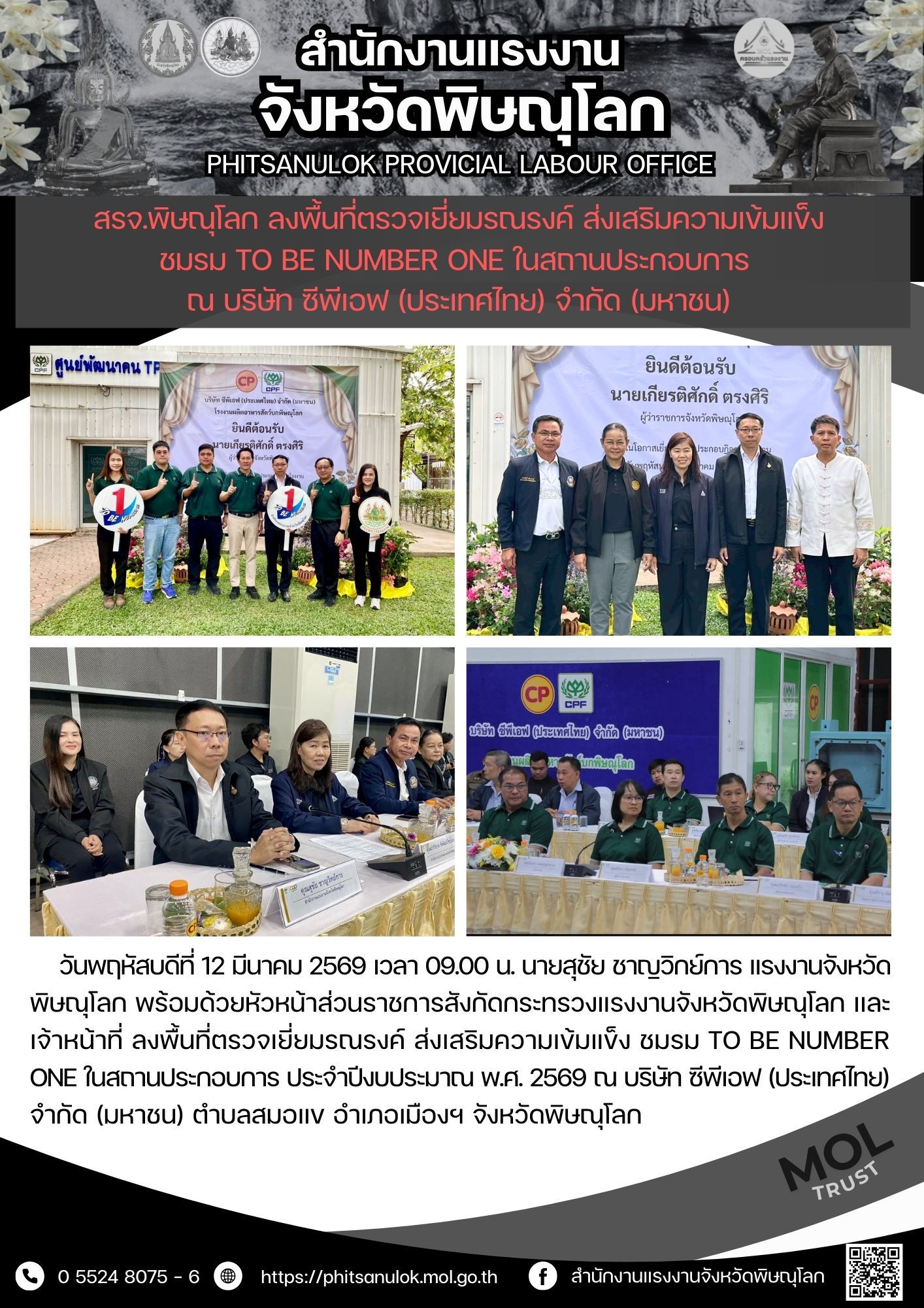 สรจ.พิษณุโลก ลงพื้นที่ตรวจเยี่ยมรณรงค์ ส่งเสริมความเข้มแข็ง ชมรม TO BE NUMBER ONE ในสถานประกอบการ ณ บริษัท ซีพีเอฟ (ประเทศไทย) จำกัด (มหาชน)