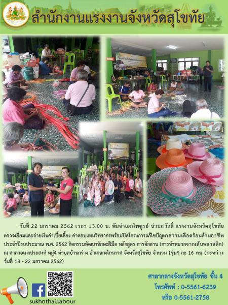 แรงงานจังหวัดสุโขทัย ตรวจเยี่ยมและจ่ายเงินค่าเบี้ยเลี้ยง ค่าตอบแทนวิทยากรพร้อมปิดโครงการแก้ไขปัญหาความเดือดร้อนด้านอาชีพ ประจำปีงบประมาณ พ.ศ. 2562