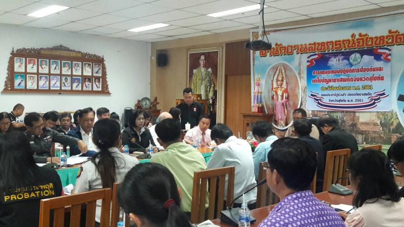 วันที่ 9 พฤศจิกายน 2560 เวลา 11.00 น. นางสาวรัตนา ทองกลับ แรงงานจังหวัดสุโขทัย ร่วมการแถลงแผนปฏิบัติการป้องกันและแก้ไขปัญหายาเสพติดจังหวัดสุโขทัย ประจำปีงบประมาณ พ.ศ. 2560 ภายใต้ "แผนประชารัฐร่วมใจ ปลอดภัยยาเสพติด จังหวัดสุโขทัย พ.ศ. 2561" ณ ห้องห้องประชุมสำนักงานสหกรณ์จังหวัดสุโขทัย ชั้น 2 ศาลากลางจังหวัดสุโขทัย โดยมี นายชัชพงศ์ เอมะสุวรรณ รองผู้ว่าราชการจังหวัดสุโขทัย เป็นประธานการแถลงแผนดังกล่าว