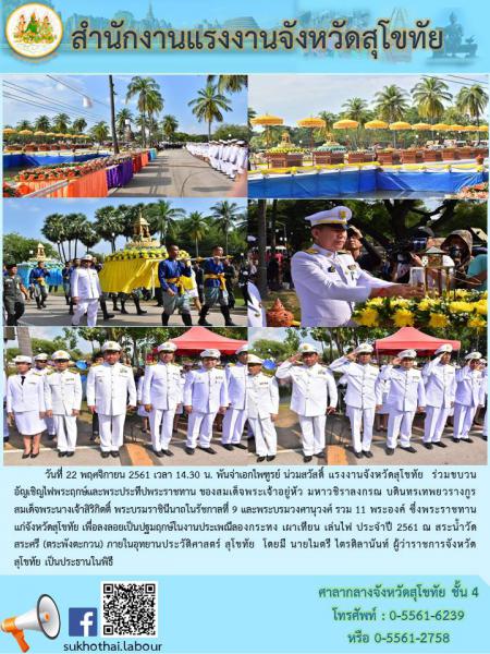 แรงงานจังหวัดสุโขทัย ร่วมขบวนอัญเชิญไฟพระฤกษ์และพระประทีปพระราชทาน ของสมเด็จพระเจ้าอยู่หัว มหาวชิราลงกรณ บดินทรเทพยวรางกูร สมเด็จพระนางเจ้าสิริกิตติ์ พระบรมราชินีนาถในรัชกาลที่ 9 และพระบรมวงศานุวงศ์ รวม 11 พระองค์ ซึ่งพระราชทานแก่จังหวัดสุโขทัย