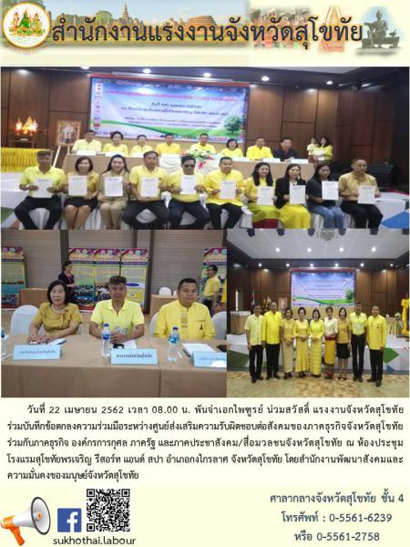 แรงงานจังหวัดสุโขทัย ร่วมบันทึกข้อตกลงความร่วมมือระหว่างศูนย์ส่งเสริมความรับผิดชอบต่อสังคมของภาคธุรกิจจังหวัดสุโขทัย ร่วมกับภาคธุรกิจ องค์กรการกุศล ภาครัฐ และภาคประชาสังคม/สื่อมวลชนจังหวัดสุโขทัย