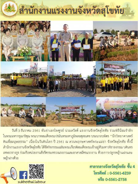 แรงงานจังหวัดสุโขทัย ร่วมพิธีน้อมรำลึกในพระมหากรุณาธิคุณ พระบาทสมเด็จพระปรมินทรมหาภูมิพลอดุลยเดช บรมนาถบพิตร “นักวิทยาศาสตร์ดินเพื่อมนุษยธรรม” เนื่องในวันดินโลก ปี 2561