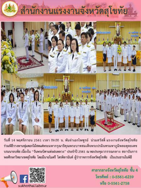 แรงงานจังหวัดสุโขทัย ร่วมพิธีวางพานพุ่มดอกไม้สดแด่พระมหากรุณาธิคุณพระบาทสมเด็จพระปรมินทรมหาภูมิพลอดุลยเดช บรมนาถบพิธ เนื่องใน “วันพระบิดาแห่งฝนหลวง” ประจำปี 2561