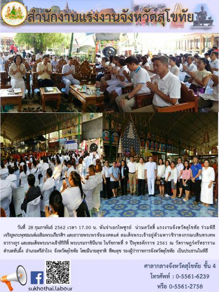 แรงงานจังหวัดสุโขทัย ร่วมพิธีเจริญพระพุทธมนต์เฉลิมพระเกียรติฯ และถวายพระพรชัยมงคลแด่ สมเด็จพระเจ้าอยู่หัวมหาวชิราลงกรณ บดินทรเทพยวรางกูร และสมเด็จพระนางเจ้าสิริกิติ์ พระบรมราชินีนาถ ในรัชกาลที่ 9 ปีพุทธศักราช 2561