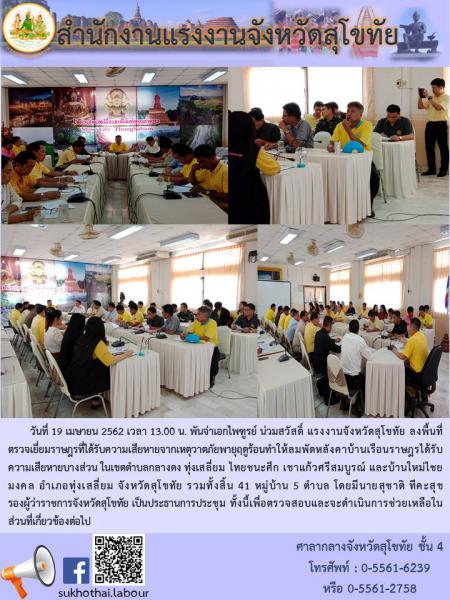แรงงานจังหวัดสุโขทัย ลงพื้นที่ตรวจเยี่ยมราษฎรที่ได้รับความเสียหายจากเหตุวาตภัยพายุฤดูร้อนทำให้ลมพัดหลังคาบ้านเรือนราษฎรได้รับความเสียหายบางส่วน ในเขตตำบลกลางดง ทุ่งเสลี่ยม ไทยชนะศึก เขาแก้วศรีสมบูรณ์ และบ้านใหม่ไชยมงคล อำเภอทุ่งเสลี่ยม