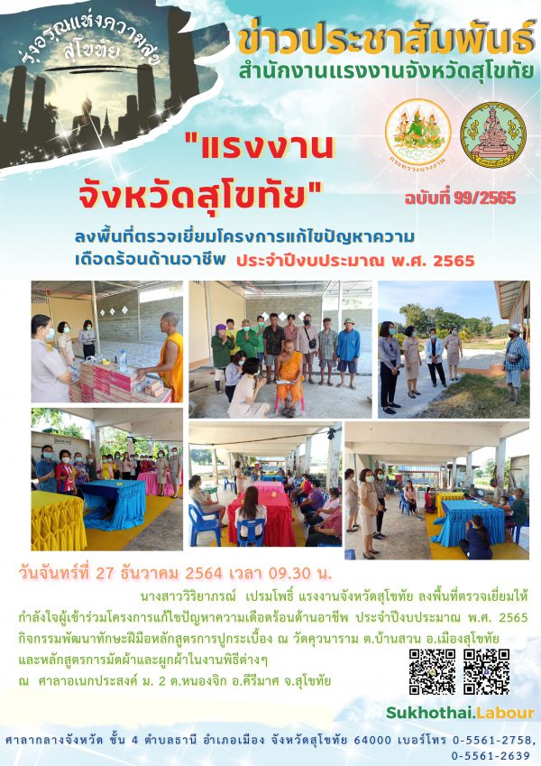 แรงงานจังหวัดสุโขทัย ลงพื้นที่ตรวจเยี่ยมโครงการแก้ไขปัญหาความเดือดร้อนด้านอาชีพ ประจำปีงบประมาณ พ.ศ. 2565