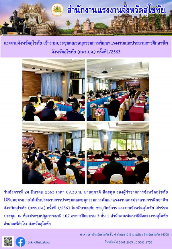 แรงงานจังหวัดสุโขทัย เข้าร่วมประชุมคณะอนุกรรมการพัฒนาแรงงานและประสานการฝึกอาชีพจังหวัดสุโขทัย (กพร.ปจ.) ครั้งที่ 1/2563
