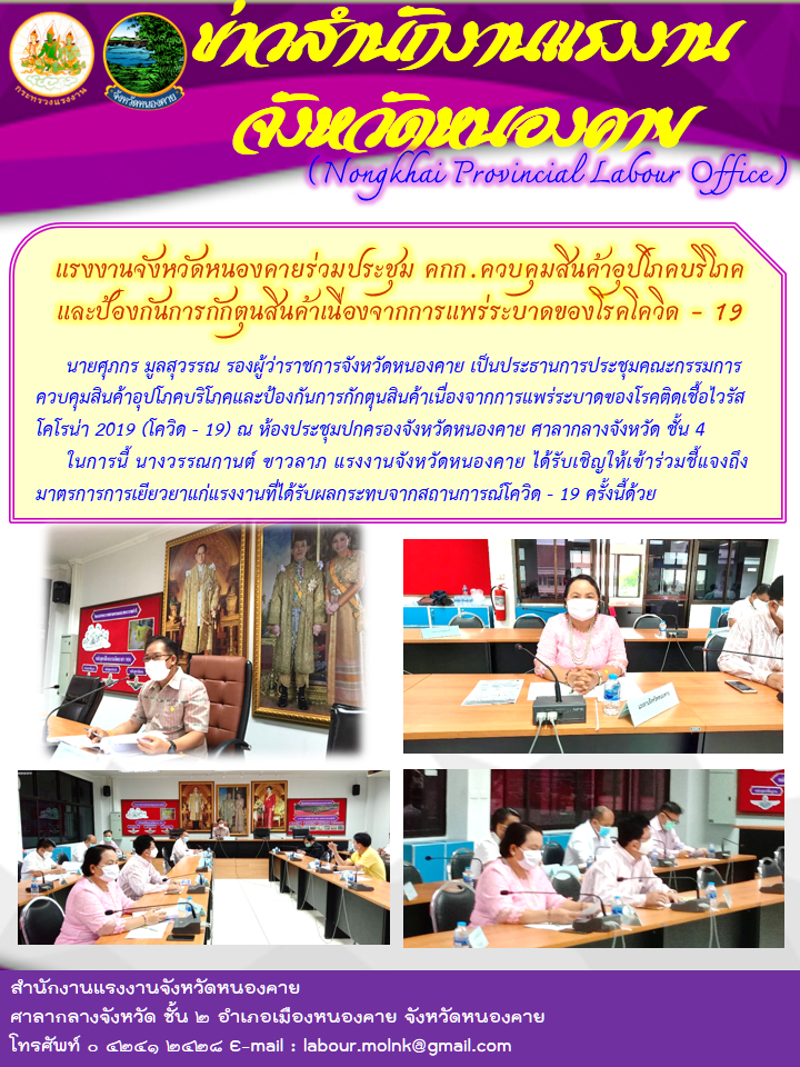 วันที่ 7 เมษายน 2563 เวลา 09.30 น. นายศุภกร มูลสุวรรณ รองผู้ว่าราชการจังหวัดหนองคาย เป็นประธานการประชุมคณะกรรมการควบคุมสินค้าอุปโภคบริโภคและป้องกันการกักตุนสินค้าเนื่องจากการแพร่ระบาดของโรคติดเชื้อไวรัสโคโรน่า 2019 (โควิด – 19) ณ ห้องประชุมปกครองจังหวัดหนองคาย ศาลากลาง ชั้น 4