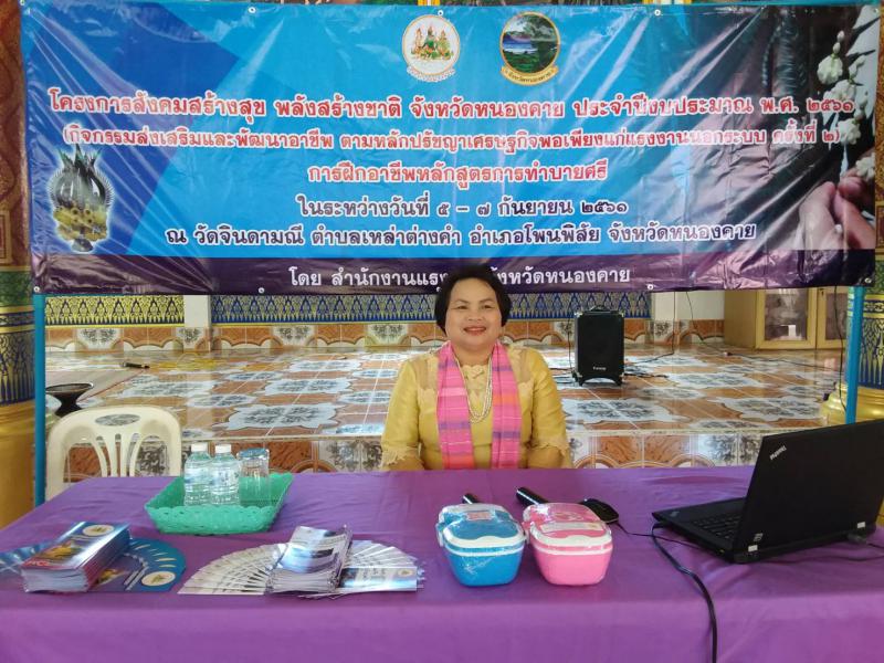 5 กันยายน 2561 เวลา 11.00 น. นางวรรณกานต์ ชาวลาภ แรงงานจังหวัดหนองคาย เป็นประธานเปิดโครงการสังคมสร้างสุข พลังสร้างชาติ กิจกรรมส่งเสริมและพัฒนาอาชีพตามหลักปรัชญาเศรษฐกิจพอเพียงแก่แรงงานนอกระบบ ครั้งที่ 2 (ฝึกอาชีพทำบายศรีพญานาค) ณ วัดจินดามณี ตำบลเหล่าต่างคำ อำเภอโพนพิสัย จังหวัดหนองคาย