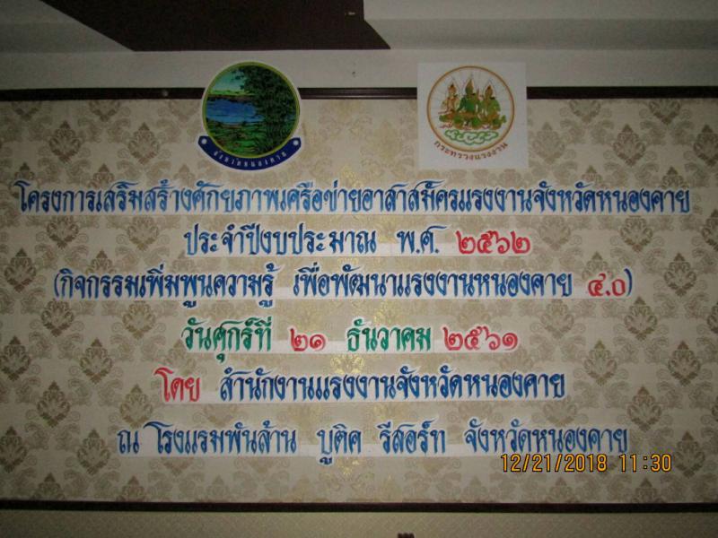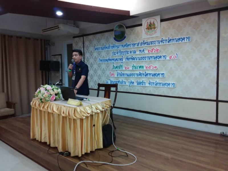 วันที่ 21 ธันวาคม 2561 นางวรรณกานต์ ขาวลาภ แรงงานจังหวัดหนองคาย ได้ดำเนินโครงการเสริมสร้างศักยภาพเครือข่ายอาสาสมัครแรงงานจังหวัดหนองคาย ประจำปีงบประมาณ พ.ศ. 2562 (กิจกรรมเพิ่มพูนความรู้ เพื่อพัฒนาแรงงานหนองคาย 4.0) ณ โรงแรมพันล้าน บูติค รีสอร์ท ตำบลมีชัย อำเภอเมืองหนองคาย จังหวัดหนองคาย ซึ่งมีกลุ่มเป้าหมายเป็นอาสาสมัครแรงงานระดับตำบลของจังหวัดหนองคาย พี่เลี้ยงอาสาสมัครแรงงานจังหวัดหนองคาย และเจ้าหน้าที่ที่เกี่ยวข้อง โดยมีการบรรยายให้ความรู้ เรื่อง องค์ความรู้ด้านผู้นำและการสร้างภาวะผู้นำให้ตนเอง โดย ดร.นารา กิตติเมธีกุล จากมหาวิทยาลัยขอนแก่น วิทยาเขตหนองคาย การบรรยาย เรื่อง โครงการโรงงานสีขาว และโครงการ มยส. โดย วิทยากรจากสำนักงานสวัสดิการและคุ้มครองแรงงานจังหวัดหนองคาย การบรรยาย เรื่อง โครงการ TO BE NUMBER ONE กิจกรรม อสร. ต้านภัยยาเสพติด และการบรรยาย เรื่อง การใช้การประชาสัมพันธ์ในการรณรงค์แก้ไขปัญหาแรงงานในระดับพื้นที่ โดย ดร.วรรณกานต์ ขาวลาภ แรงงานจังหวัดหนองคาย เพื่อเพิ่มพูนความรู้ ในการพัฒนาการให้บริการด้านแรงงาน รวมทั้งสร้างเสริมเครือข่ายการป้องกันยาเสพติดในสถานประกอบการที่มีลูกจ้างต่ำกว่า 10 ลงมา และกลุ่มแรงงานนอกระบบของจังหวัดหนองคาย ให้ห่างไกลจากปัญหายาเสพติดต่อไป