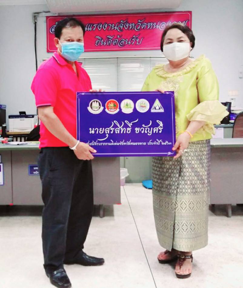 วันที่ 3 สิงหาคม 2563 นางวรรณกานต์ ขาวลาภ แรงงานจังหวัดหนองคาย ได้มอบป้ายอาสาสมัครแรงงานดีเด่นจังหวัดหนองคาย ประจำปี 2563 ให้แก่นายสุรสิทธิ์ ขวัญศรี อาสาสมัครแรงงานตำบลรัตนวาปี อำเภอรัตนวาปี จังหวัดหนองคาย เพื่อเป็นขวัญกำลังใจและใช้ในการประชาสัมพันธ์การให้บริการด้านแรงงานในพื้นที่ต่อไป