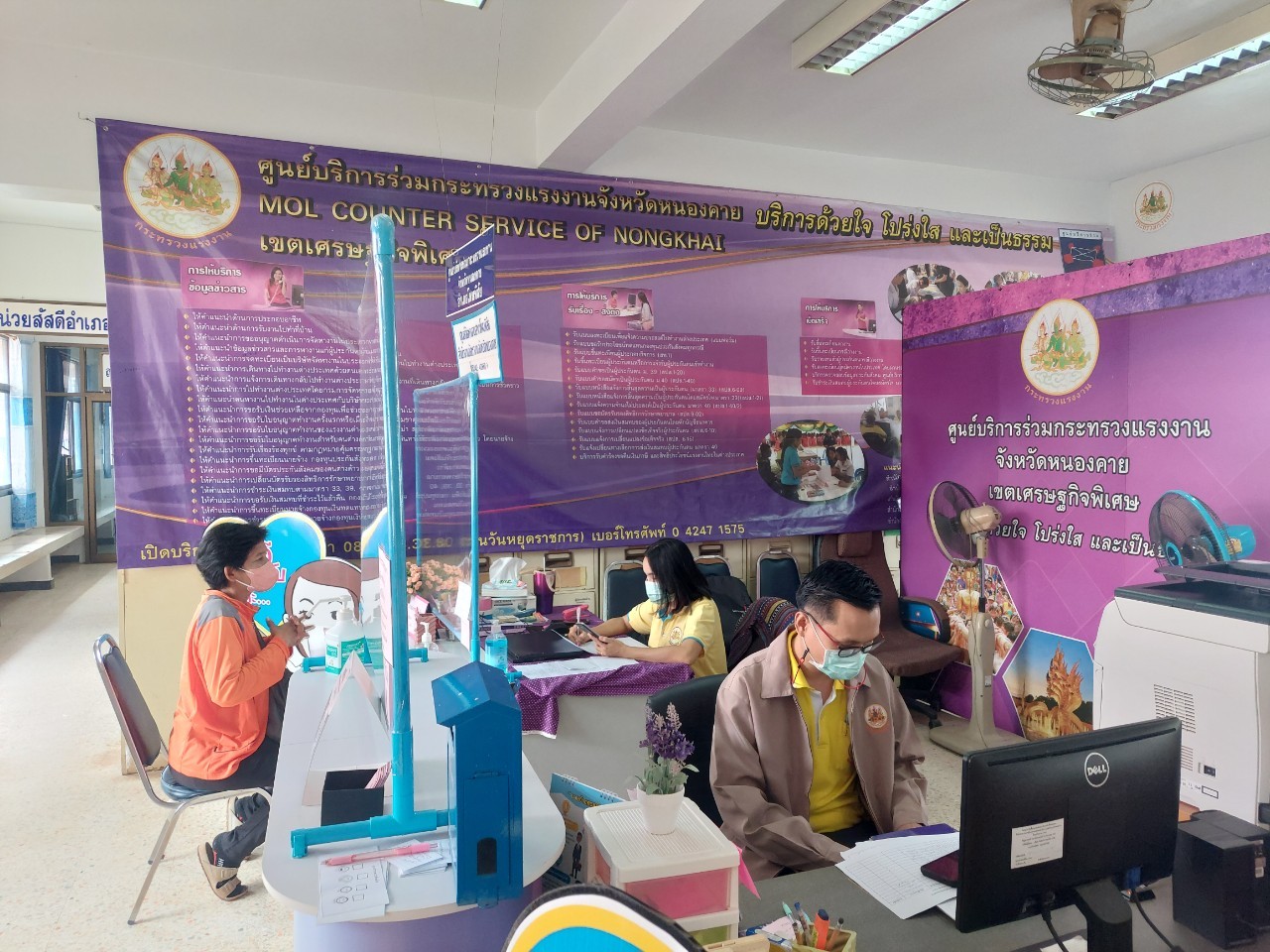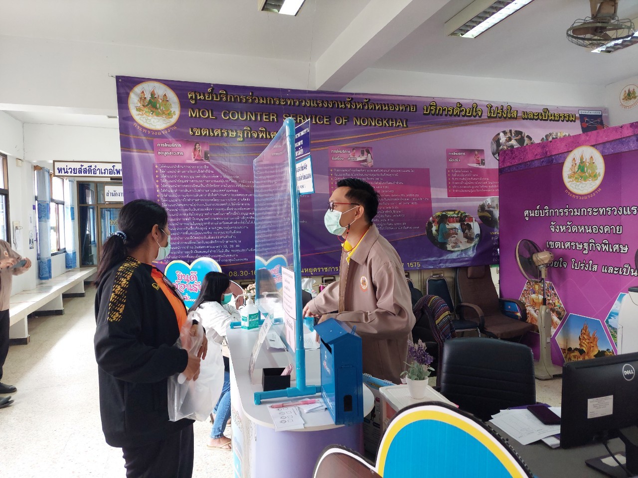 วันที่ 17 กุมภาพันธ์ 2565 นางสมหมาย เทียมกัน แรงงานจังหวัดหนองคาย มอบหมายให้ นายเทวินทร์ วงศ์กันทิยะ นักวิชาการแรงงานปฏิบัติการ ตรวจเยี่ยมและสอบถามถึงปัญหาอุปสรรคในการให้บริการของศูนย์บริการร่วมกระทรวงแรงงานจังหวัดหนองคาย ณ ศูนย์บริการร่วมกระทรวงแรงงานจังหวัดหนองคาย ที่ว่าการอำเภอโพนพิสัย ชั้น 1 ตำบลจุมพลอำเภอโพนพิสัย จังหวัดหนองคาย