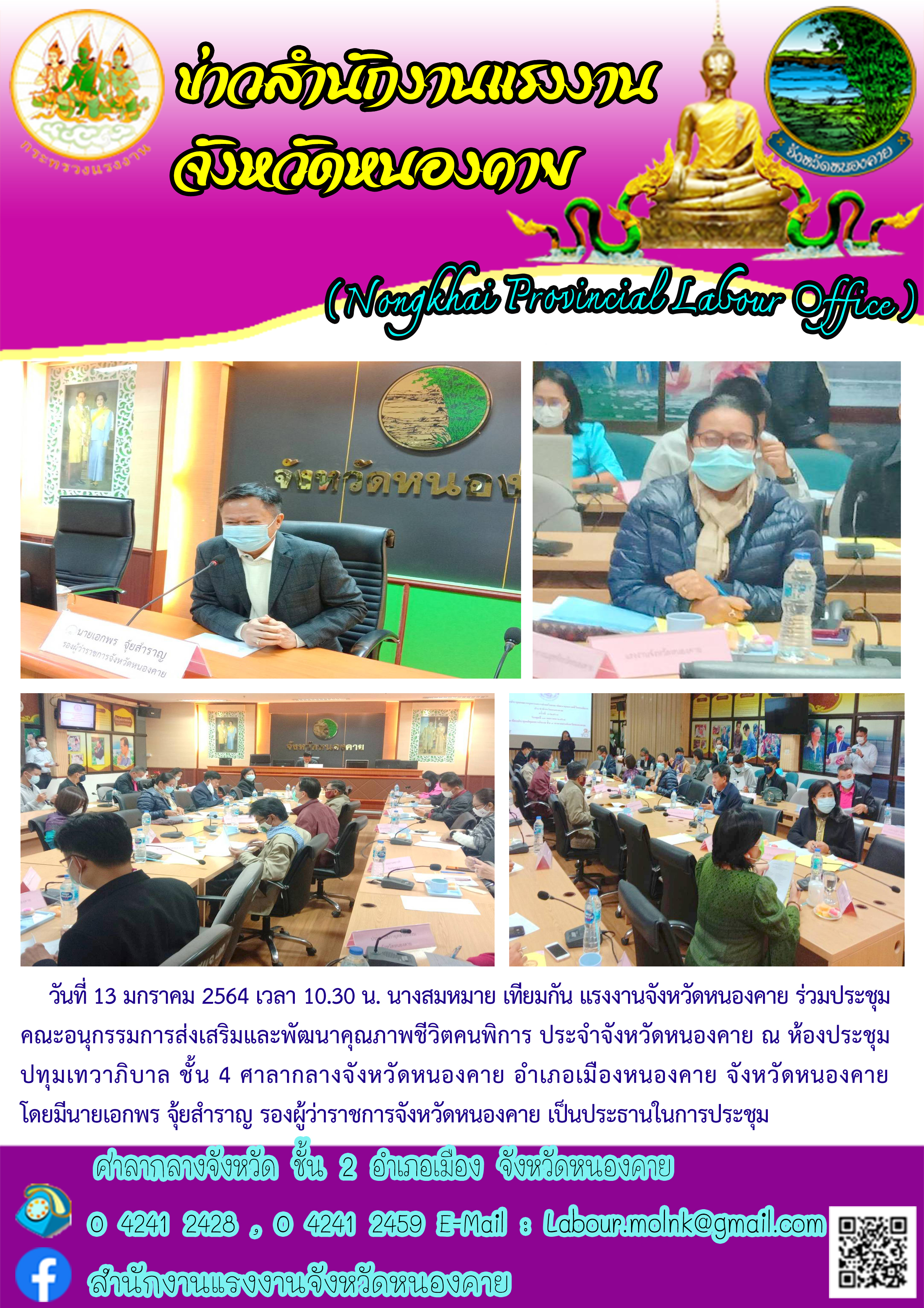 วันที่ 13 มกราคม 2564 เวลา 10.30 น. นางสมหมาย เทียมกัน แรงงานจังหวัดหนองคาย ร่วมประชุมคณะอนุกรรมการส่งเสริมและพัฒนาคุณภาพชีวิตคนพิการ ประจำจังหวัดหนองคาย ณ ห้องประชุมปทุมเทวาภิบาล ชั้น 4 ศาลากลางจังหวัดหนองคาย อำเภอเมือง จังหวัดหนองคาย โดยมีนายเอกพร จุ้ยสำราญ รองผู้ว่าราชการจังหวัดหนองคาย เป็นประธานในการประชุม