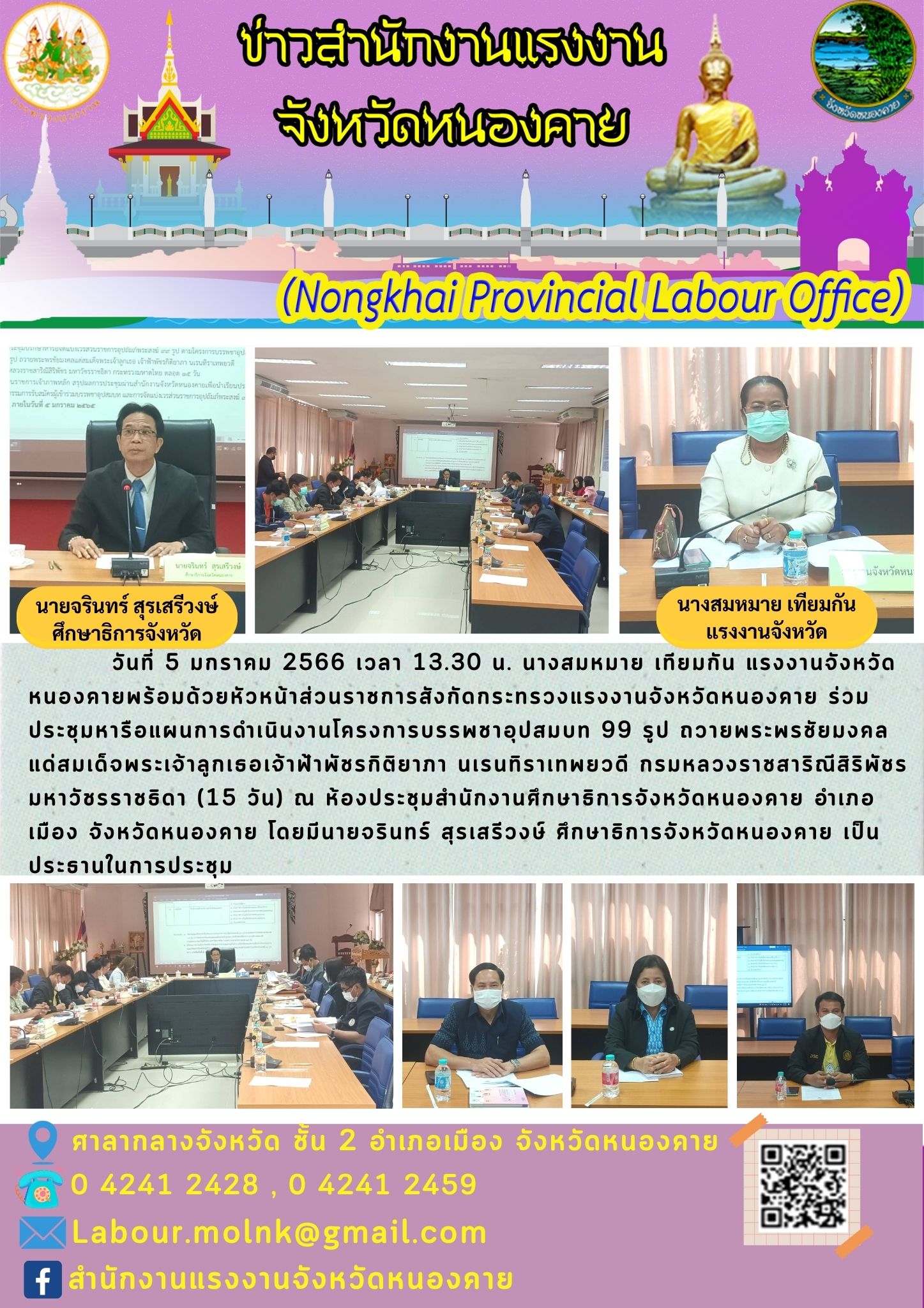 วันที่ 5 มกราคม 2566 เวลา 13.30 น. นางสมหมาย เทียมกัน แรงงานจังหวัดหนองคาย พร้อมด้วยหัวหน้าส่วนราชการสังกัดกระทรวงแรงงานจังหวัดหนองคาย ร่วมประชุมหารือแผนการดำเนินงานโครงการบรรพชาอุปสมบท 99 รูป ถวายพระพรชัยมงคล แด่สมเด็จพระเจ้าลูกเธอเจ้าฟ้าพัชรกิติยาภา นเรนทิราเทพยวดี กรมหลวงราชสาริณีสิริพัชร มหาวัชรราชธิดา (15 วัน) ณ ห้องประชุมสำนักงานศึกษาธิการจังหวัดหนองคาย อำเภอเมือง จังหวัดหนองคาย โดยมีนายจรินทร์ สุรเสรีวงษ์ ศึกษาธิการจังหวัดหนองคาย เป็นประธานในการประชุม