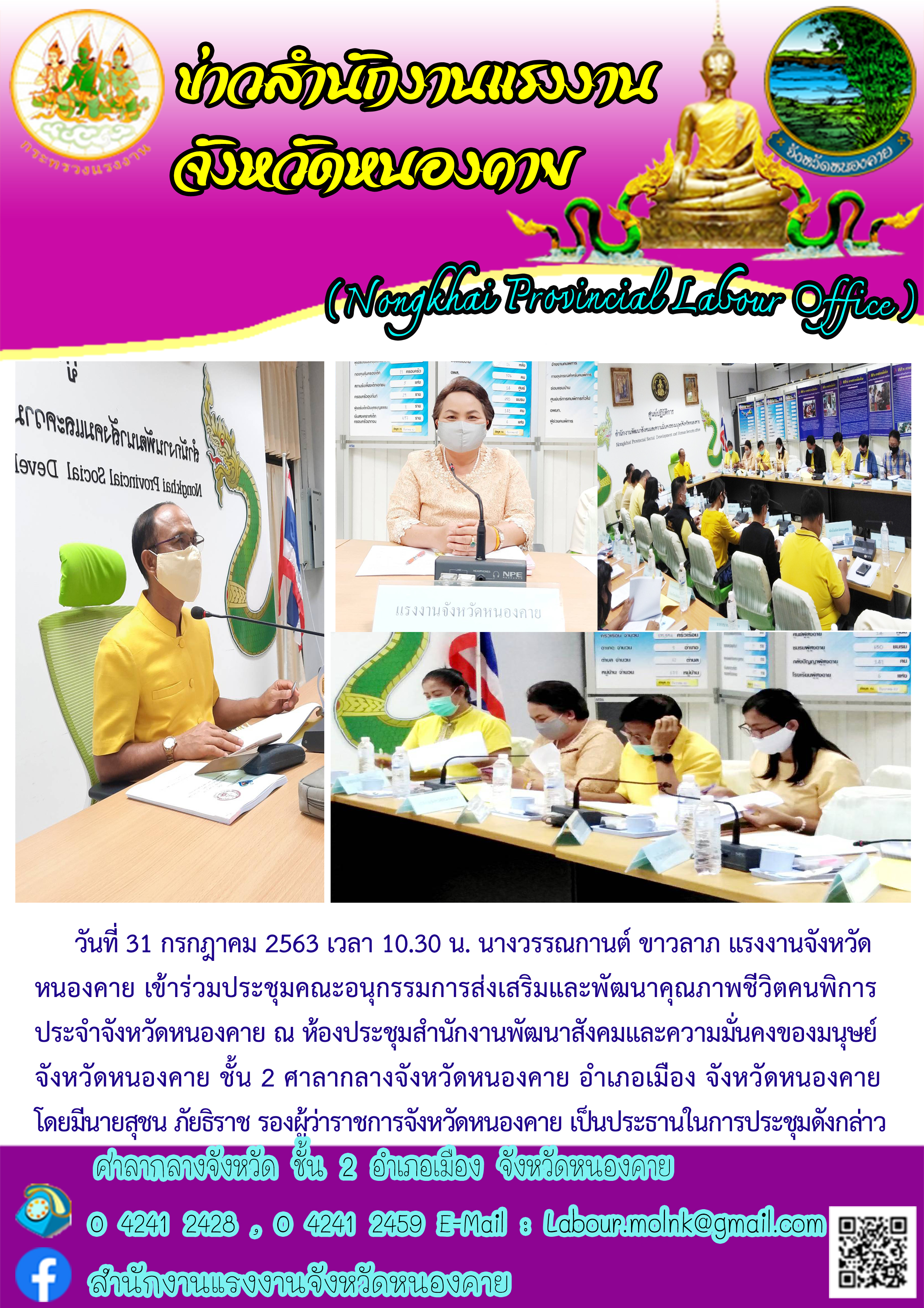 วันที่ 31 กรกฎาคม 2563 เวลา 10.30 น. นางวรรณกานต์ ขาวลาภ แรงงานจังหวัดหนองคาย เข้าร่วมประชุมคณะอนุกรรมการส่งเสริมและพัฒนาคุณภาพชีวิตคนพิการประจำจังหวัดหนองคาย ณ ห้องประชุมสำนักงานพัฒนาสังคมและความมั่นคงของมนุษย์จังหวัดหนองคาย ชั้น 2 ศาลากลางจังหวัดหนองคาย อำเภอเมือง จังหวัดหนองคาย โดยมีนายสุชน ภัยธิราช รองผู้ว่าราชการจังหวัดหนองคาย เป็นประธานในการประชุมดังกล่าว
