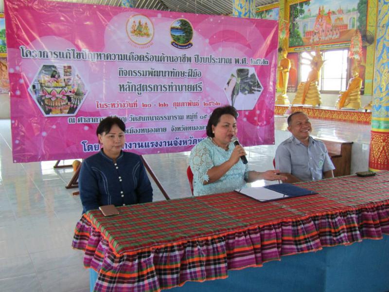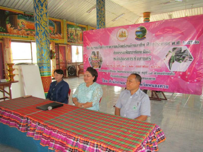วันที่ 20 กุมภาพันธ์ 2562 เวลา 13.00 น. นางวรรณกานต์ ขาวลาภ แรงงานจังหวัดหนองคาย เดินทางไปเป็นประธานเปิดโครงการแก้ไขปัญหาความเดือดร้อนด้านอาชีพจังหวัดหนองคาย ปีงบประมาณ 2562 ในกิจกรรมพัฒนาทักษะฝีมือ หลักสูตรการทำบายศรี ณ ศาลาการเปรียญ วัดสนทนาธรรมาราม ม.15 ต.บ้านเดื่อ อ.เมือง ซึ่งเป็นการส่งเสริมให้แรงงานในพื้นที่มีรายได้ในการดำรงชีพของตนเองและครอบครัวเป็นการชั่วคราว และสามารถฝึกทักษะและพัฒนาศักยภาพในสาขาอาชีพ สร้างโอกาส และทางเลือกในการประกอบอาชีพให้เกิดรายได้ เพื่อความมั่นคง และยั่งยืน