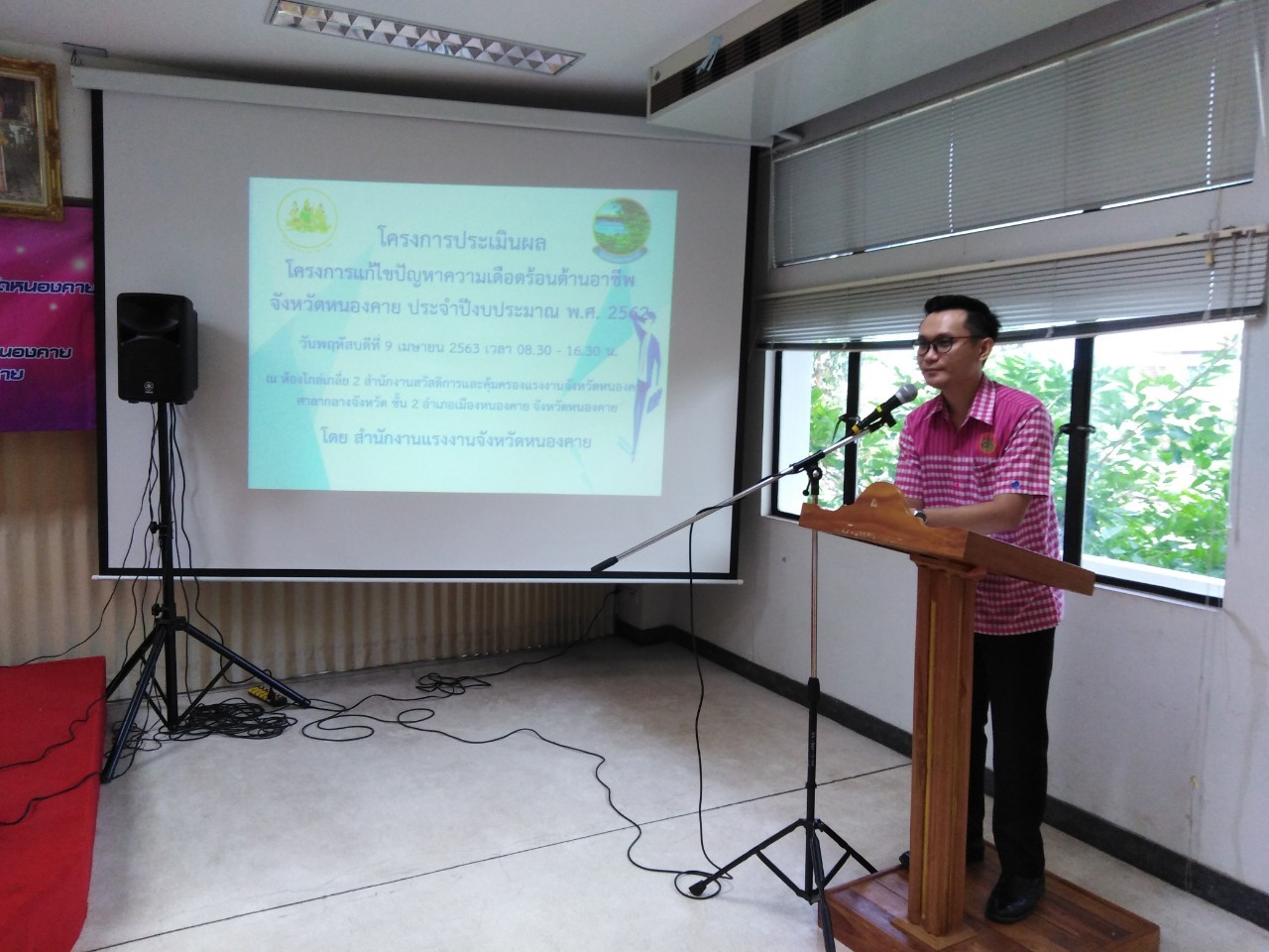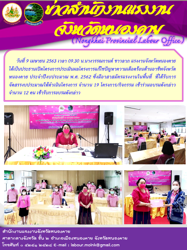 วันที่ 9 เมษายน 2563 เวลา 09.30 น. นางวรรณกานต์ ขาวลาภ แรงงานจังหวัดหนองคาย ได้เป็นประธานเปิดโครงการประเมินผลโครงการแก้ไขปัญหาความเดือดร้อนด้านอาชีพจังหวัดหนองคาย ประจำปีงบประมาณ พ.ศ. 2562 ซึ่งมีอาสาสมัครแรงงานในพื้นที่ที่ได้รับการจัดสรรงบประมาณให้ดำเนินโครงการ จำนวน 19 โครงการ/กิจกรรม เข้าร่วมอบรมดังกล่าว จำนวน 12 คน เข้ารับการอบรมดังกล่าว