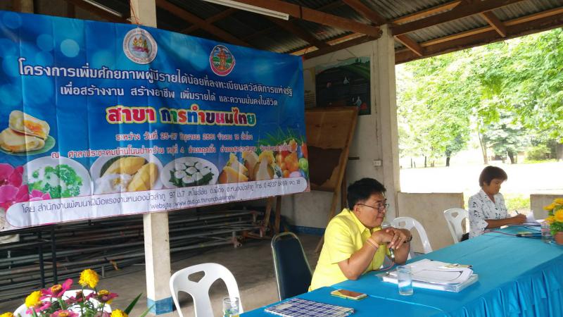 วันจันทร์ที่ 25 มิถุนายน 2561 เวลา 10.30 น นายอำนาจ เชิงไว แรงงานจังหวัดหนองบัวลำภู บรรยายให้ความรู้เรื่องนโยบายของรัฐบาลนโยบายกระทรวงแรงงานและภารกิจของสำนักงานแรงงานจังหวัดให้กับผู้เข้ารับการอบรมสาขาการทำขนมไทย จำนวน 25 คนตามโครงการพัฒนาศักยภาพผู้มีรายได้น้อยที่ลงทะเบียนแห่งรัฐเพื่อสร้างงาน สร้างอาชีพเพิ่มรายได้และความมั่นคงในชีวิตประจำปีงบประมาณพ. ศ. 2561 ณ ศาลาประชาคม บ้านโนนป่าหว้าน หมู่ที่ 4 ตำบลกุดผึ้ง อําเภอสุวรรณคูหาจังหวัดหนองบัวลำภู