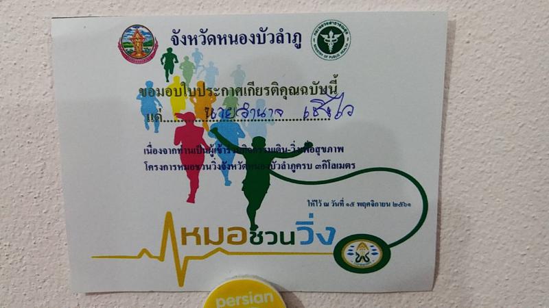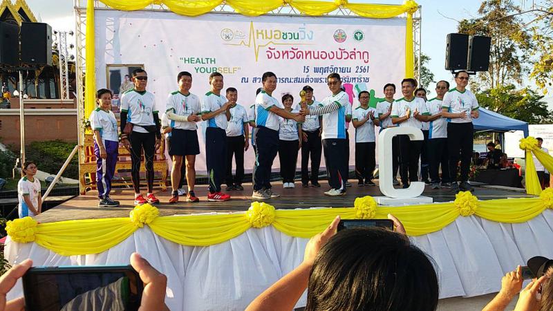 วันพฤหัสบดีที่ 15 พฤศจิกายน 2561 เวลา 16.30 น. นายอำนาจ เชิงไว แรงงานจังหวัดหนองบัวลำภูและหัวหน้าส่วนราชการสังกัดกระทรวงแรงงานจังหวัดหนองบัวลำภู พร้อมด้วยหัวหน้าส่วนราชการ อำเภอองค์กรปกครองส่วนท้องถิ่นภาคเอกชนนักเรียนนักศึกษาและประชาชนทั่วไปจำนวน 1,700 คน ร่วมกิจกรรมโครงการหมอชวนวิ่งจังหวัดหนองบัวลำภู และพิธีรับมอบคทา บรรจุมวลสารศักดิ์สิทธิ์ จากคณะนักวิ่งจังหวัดอุดรธานี ณ สนามสมเด็จพระนเรศวรมหาราช อำเภอเมือง จังหวัดหนองบัวลำภู โดย…นายเวียงชัย แก้วพินิจ รองผู้ว่าราชการจังหวัดหนองบัวลำภูเป็นประธานในพิธีเปิดโครงการ โดยวิ่งเป็นระยะทาง 3.5 กิโลเมตร